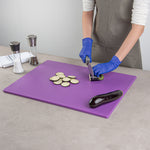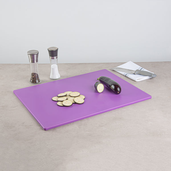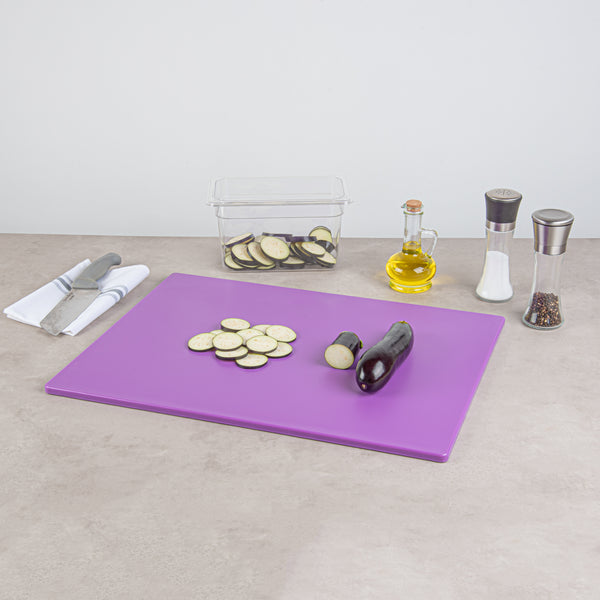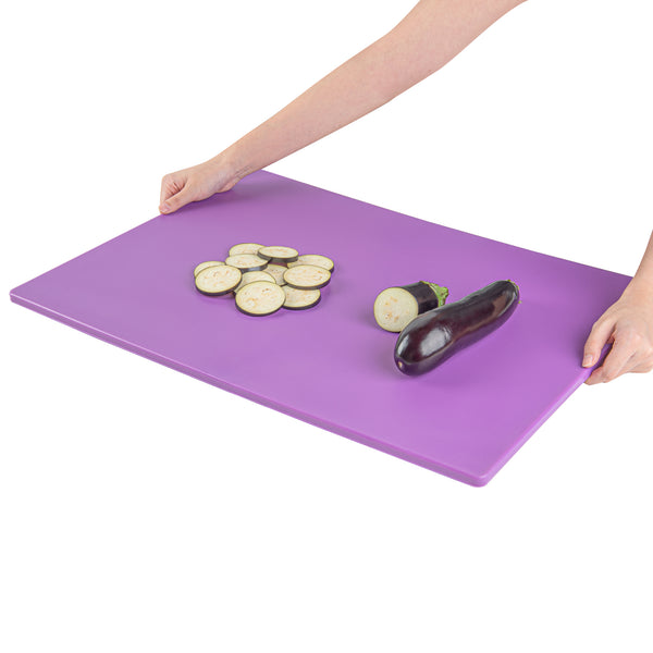 Upgrade your food prep process with our Chef 101 Purple Plastic Cutting Board. Crafted from high-density polyethylene, this cutting board resists cut grooving without dulling your knives, ensuring top-notch performance in your kitchen. The non-absorbent surface of this commercial plastic chopping board for allergen-free foods prevents juice, bacteria, and odor from seeping in, making this plastic chopping board a hygienic choice for busy kitchens. Boasting a non-skid design, this plastic food prep board securely stays in place during use, eliminating slips and accidents. This color-coded chopping board system helps to prevent cross-contamination, ensuring compliance with HACCP standards and maintaining a safe and efficient commercial kitchen. Measuring 24 inches in length by 18 inches in width, this purple plastic cutting board provides ample space for all your chopping, slicing, and dicing needs. Sold in a 1 count box.