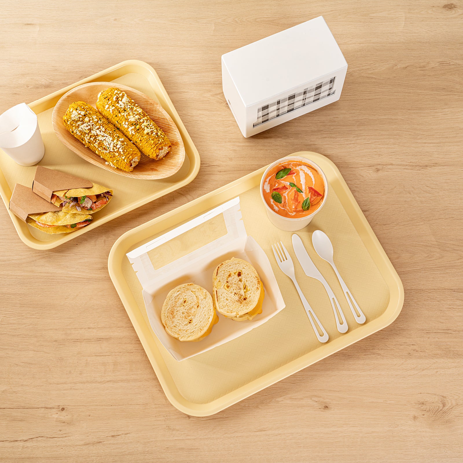 The no-skid bottom feature on these school lunch trays provides a stable platform for holding food and drinks, reducing the risk of spills and ensuring a secure dining experience. These trays won't slide or tip easily!