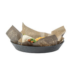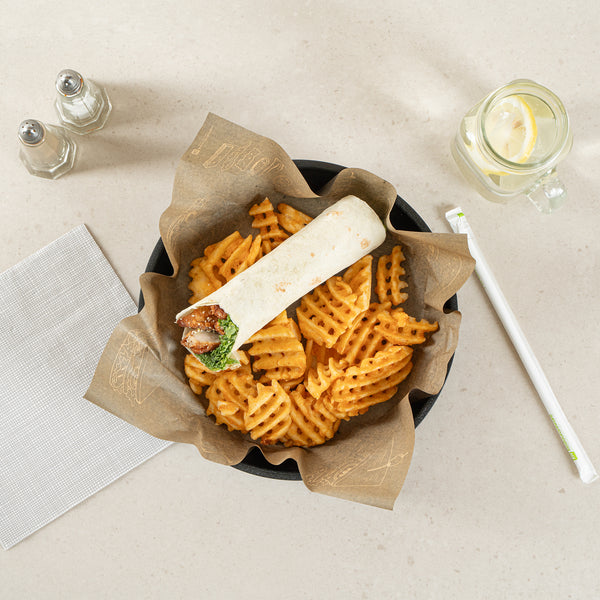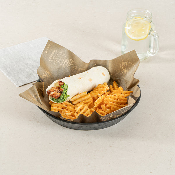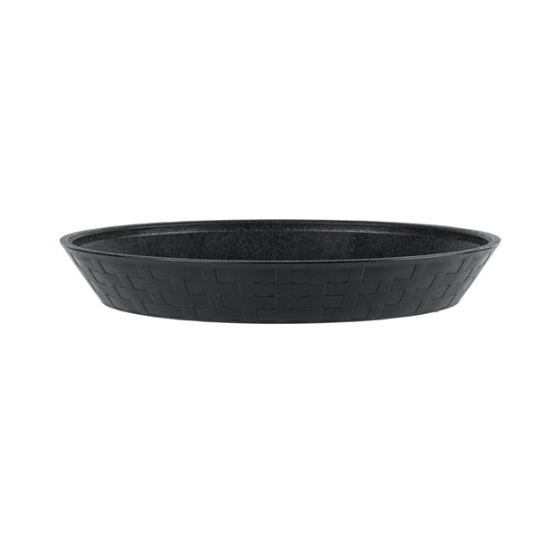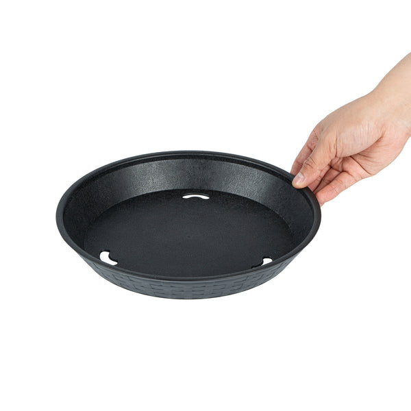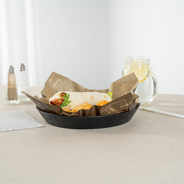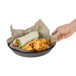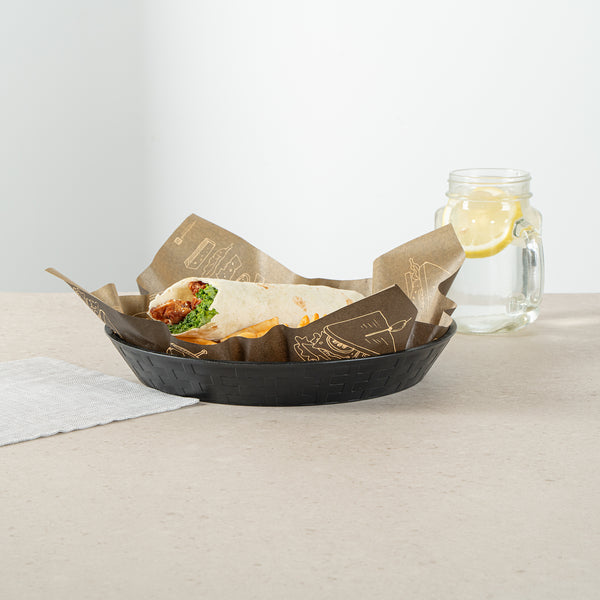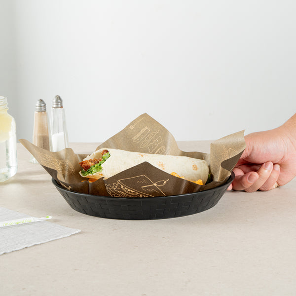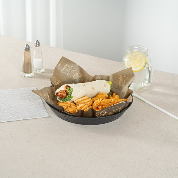 Elevate your food presentation with our Chef 101 Round Black Plastic Diner Platters. Made from durable plastic, these lightweight baskets are suitable for serving fried foods, wings, sandwiches, or appetizers. Built-in drain holes aid in post-wash drying to avoid water pooling, ensuring your diner platter remains clean and dry. The microwave-secure construction of these plastic platters allows for quick reheating of meals, making them apt for busy kitchens. Designed for easy cleaning in a dishwasher, these serving trays offer effortless and time-saving cleanup. Stackable for space-saving storage and easy portability, these reusable platters are a practical addition to any foodservice operation. The bold black color enhances food presentation, while the lattice sides add a classic, timeless look to your food platters. Measuring 10.43 inches in diameter by 1.38 inches in height, these platters provide ample space for a variety of dishes. Sold in a 100 count box.