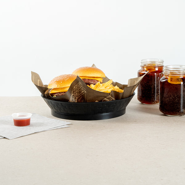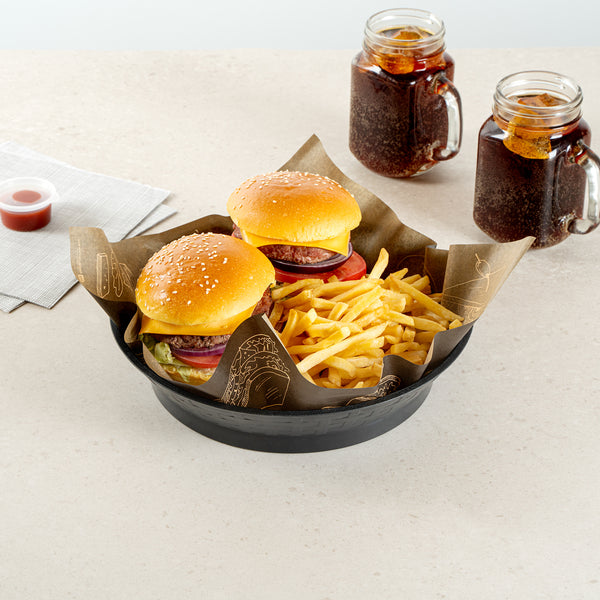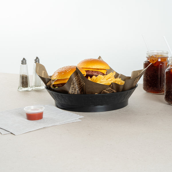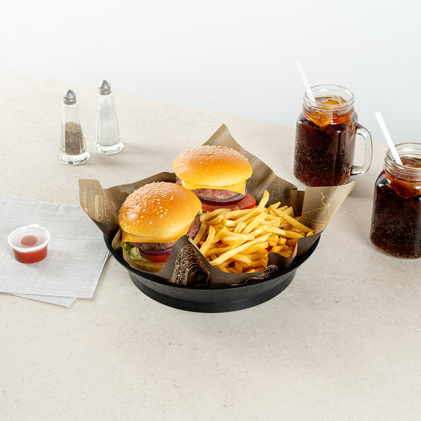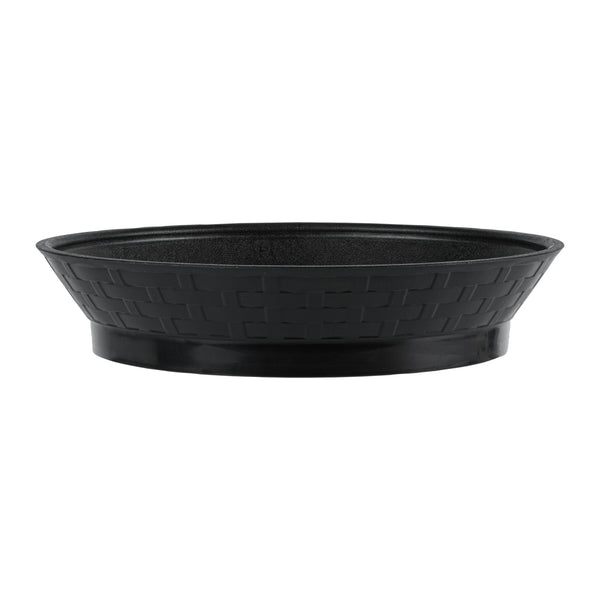 Serve your customers in style with our Chef 101 Round Black Plastic Diner Platters. Made from durable plastic, these lightweight serving trays are suitable for presenting fried foods, wings, sandwiches, or appetizers. These reusable platters feature a raised base that elevates food above the table for added visual appeal. Built-in drain holes aid in post-wash drying to avoid water pooling, ensuring your food platters are always ready for use. The microwave-secure construction of these diner platters allows for quick reheating of meals, making them highly convenient for busy kitchens. With a design that allows for easy cleaning in dishwashers, these serving trays ensure effortless cleanup. These stackable plastic platters offer space-saving storage and easy portability, enhancing your kitchen's efficiency. Measuring 10.47 inches in diameter by 2.17 inches in height, these food platters provide ample space for a variety of dishes. Sold in a 100 count box.