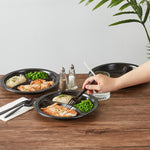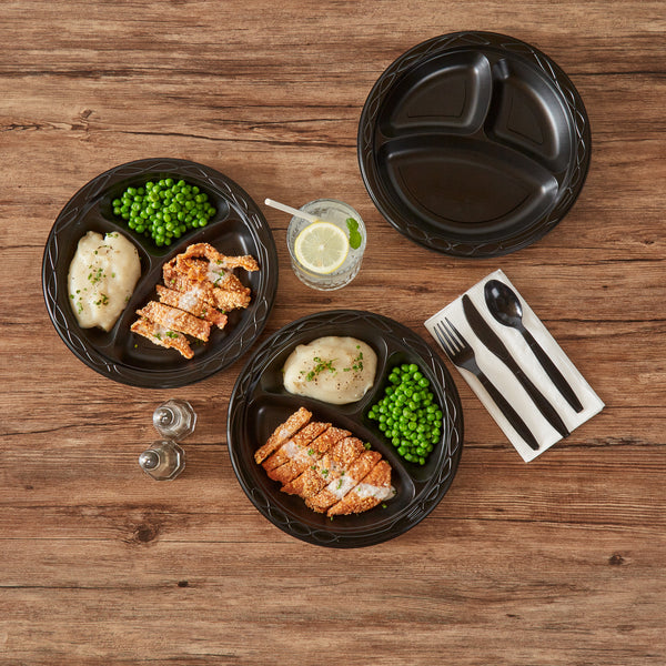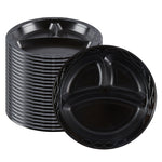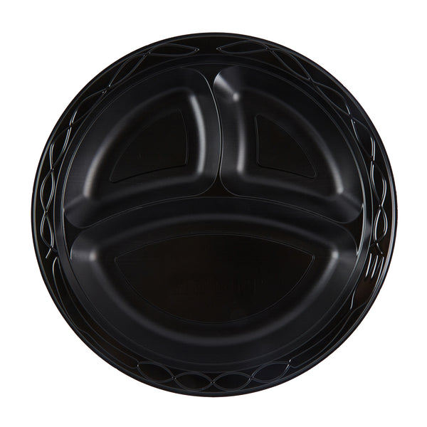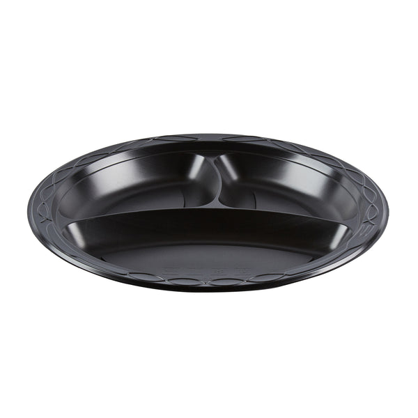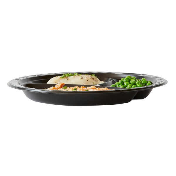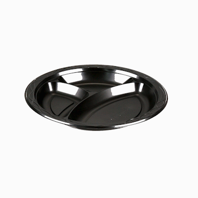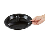 ROUND BLACK PLASTIC PLATE - 3 COMPARTMENTS, MICROWAVABLE