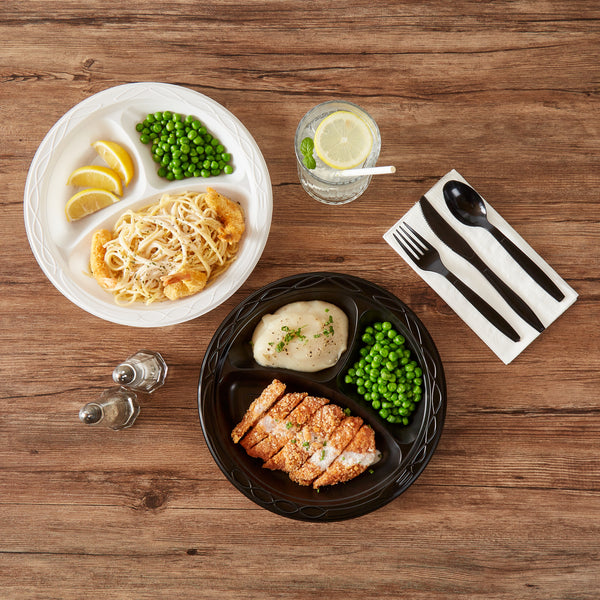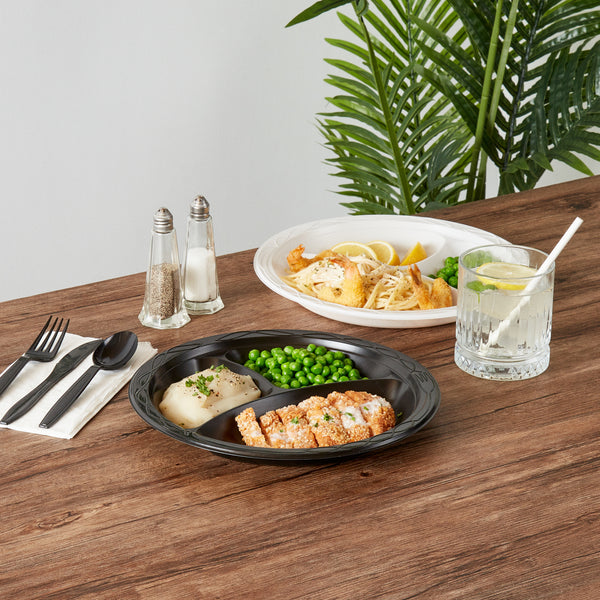 Serve your culinary creations with our Chef 101 Round Black Plastic Plates. These party plates feature 3 compartments and facilitate easy separation of various foods, enhancing convenience and presentation during gatherings. Perfect for any foodservice setting, these plastic plates are microwave-safe and allow you to easily reheat your meals. Made from premium plastic, these serving plates are suitable for serving both hot and cold food items. These black plates visually accentuate your food presentation and complement various tablescapes. Designed for convenience, these dinner plates are disposable and provide an easy cleanup after meals. Promoting sustainability, these food plates are recyclable and offer an eco-friendly way to serve meals. Measuring 10.25 inches in diameter by 1 inch in height, these disposable plates are ideal for generous servings. Sold in a 100 count box.