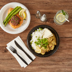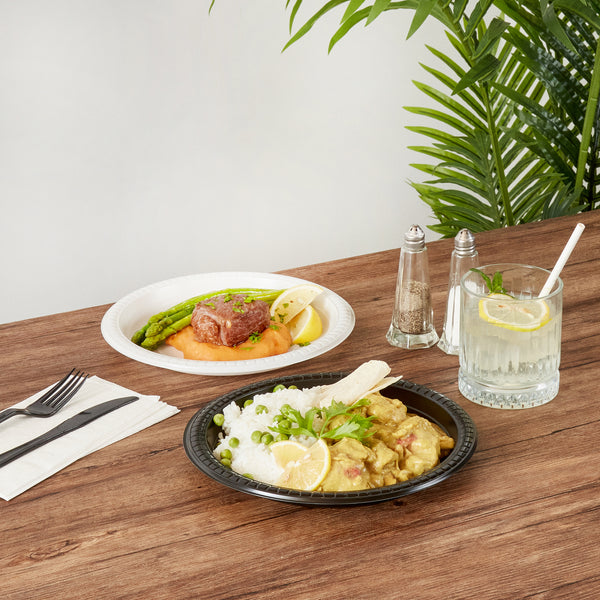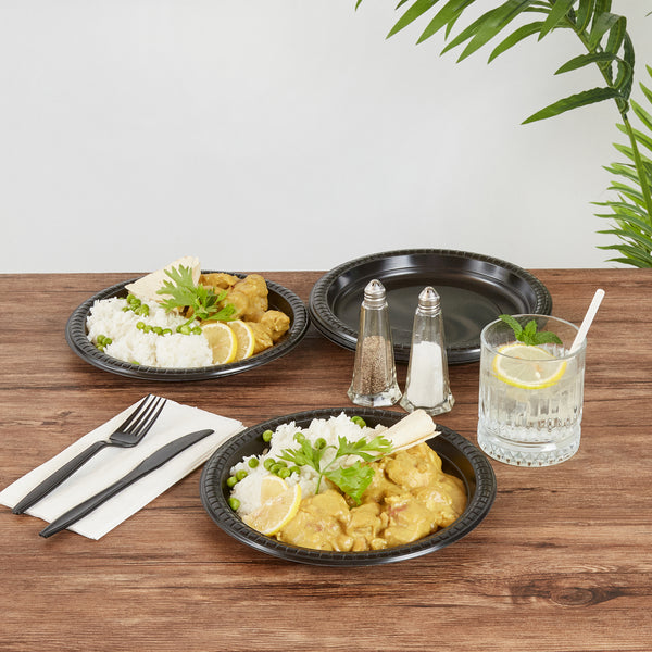 Elevate your food presentation with our Chef 101 Round Black Plastic Plates. These plastic plates are microwave-safe and allow you to easily reheat your meals. Crafted from premium plastic, these dinner plates are suitable for serving both hot and cold food items, making them ideal for various cuisines. The sleek black finish of these serving plates accentuates your food presentation and makes them visually appealing. Ideal for quick and efficient cleanup, these disposable plates can be disposed of after use, saving you time and effort. Eco-conscious consumers will appreciate that these food plates are recyclable, offering an environmentally friendly way to serve meals. Measuring 9 inches in diameter, these black plates provide ample space for a variety of dishes. Sold in a 50 count box.