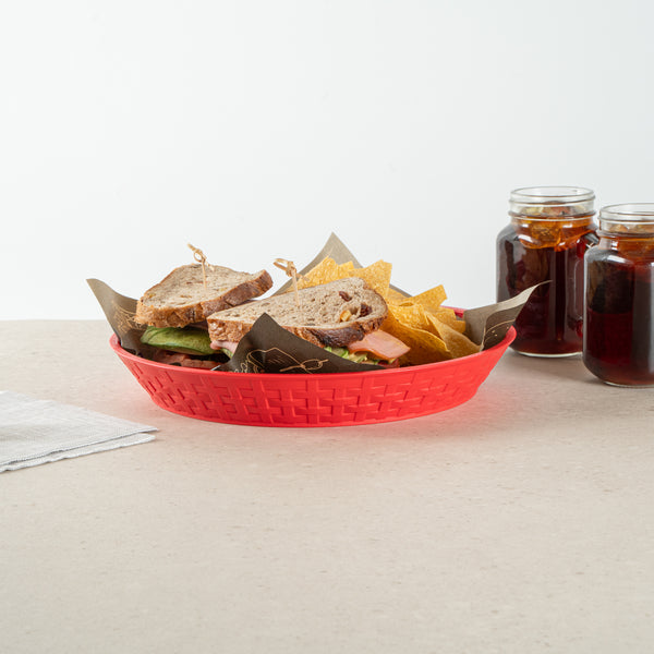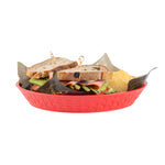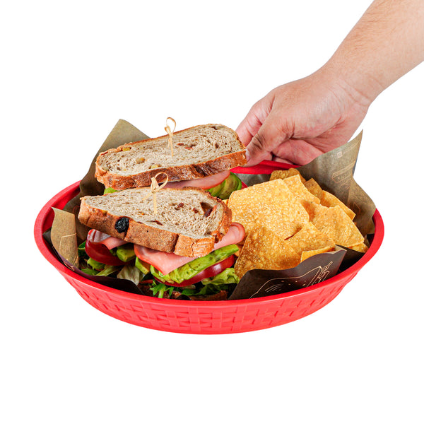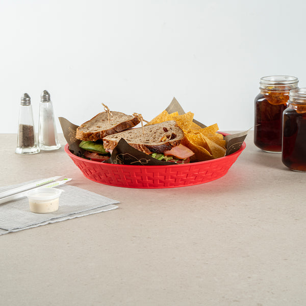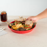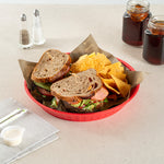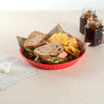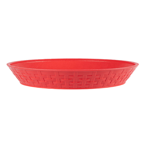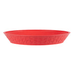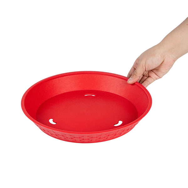Introduce a fresh touch to your foodservice offerings with our Chef 101 Round Red Plastic Diner Platters. Made from durable plastic, these reusable platters are suitable for serving fried foods, wings, sandwiches, or appetizers. Featuring built-in drain holes, these diner platters aid in post-wash drying to avoid water pooling. The microwavable design of these serving trays allows for quick reheating of meals. Designed for easy cleaning, these dishwashable food platters ensure effortless and time-saving cleanup. With stackable capabilities, these plastic platters offer space-saving storage and easy portability. The bold red color of these reusable platters enhances food presentation, while the lattice sides add a classic, timeless look. Measuring 12.01 inches in diameter by 1.77 inches in height, these serving trays are ideal for a variety of dining settings. Sold in a 10 count box.