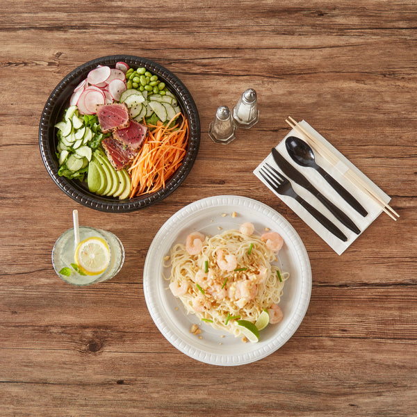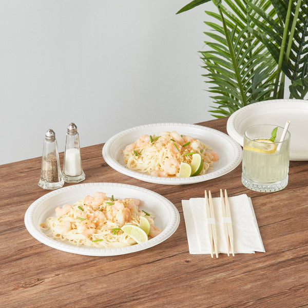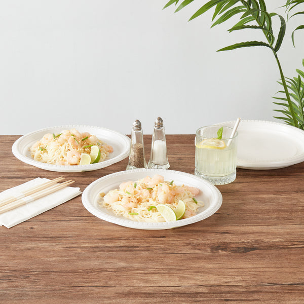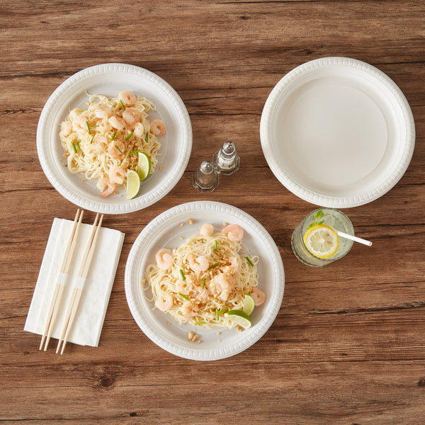 Serve your signature main course with our Chef 101 Round White Plastic Plates. To enjoy hot piping food, these plastic plates are microwave-safe and allow you to easily reheat your meals without hassle. Created from premium plastic, these serving plates are suitable for serving both hot and cold food items, making them ideal for various occasions. The elegant white finish of these dinner plates enhances your food presentation and makes them visually appealing. Perfect for any event, these disposable plates can be discarded after use provide an easy cleanup solution, saving you time and effort. These food plates are recyclable and offer an eco-friendly way to serve meals, perfect for foodservice establishments looking to reduce their carbon footprint. Measuring 10.25 inches in diameter, these white plates are ideal for a variety of dishes. Sold in a 50 count box.