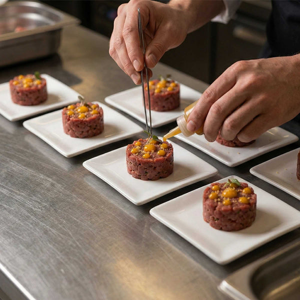 Elevate your culinary presentation with our Chef 101 Square White Porcelain Mini Edge Plates. These chip-resistant porcelain plates, crafted from porcelain, provide a durable, elegant presentation for small dishes and appetizers. Designed with a greaseproof surface, they maintain the pristine look of appetizers and desserts while being dishwasher-safe, ensuring quick cleanup during busy service. These porcelain hors d'oeuvre plates are oven-safe, allowing you to serve baked dishes directly from the oven, enhancing operational efficiency. With their sleek white finish, these plates offer a refined backdrop that enhances the visual appeal of any dish, making them ideal for catering and tasting events. Their compact 3-inch by 3-inch size makes these mini appetizer plates perfect for serving individual portions at upscale events. Sold in a 10 count box.