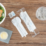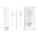 WHITE PLASTIC CUTLERY SET - WITH NAPKIN AND SALT / PEPPER PACKETS