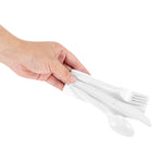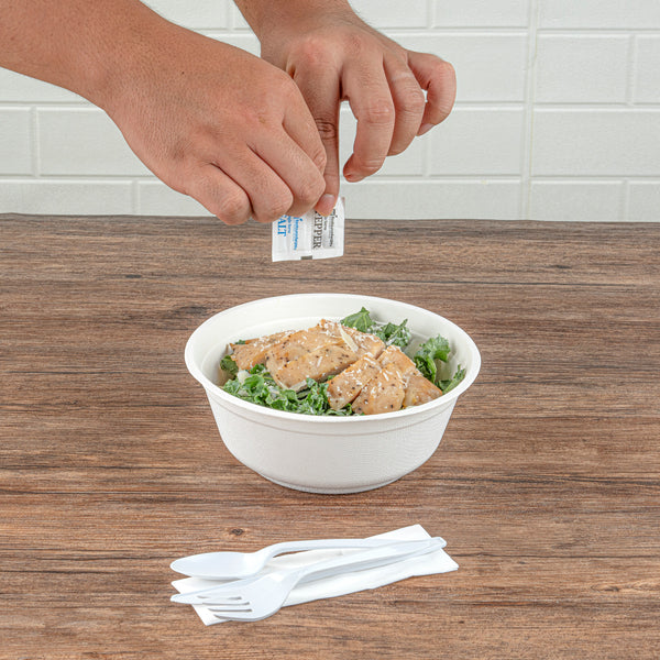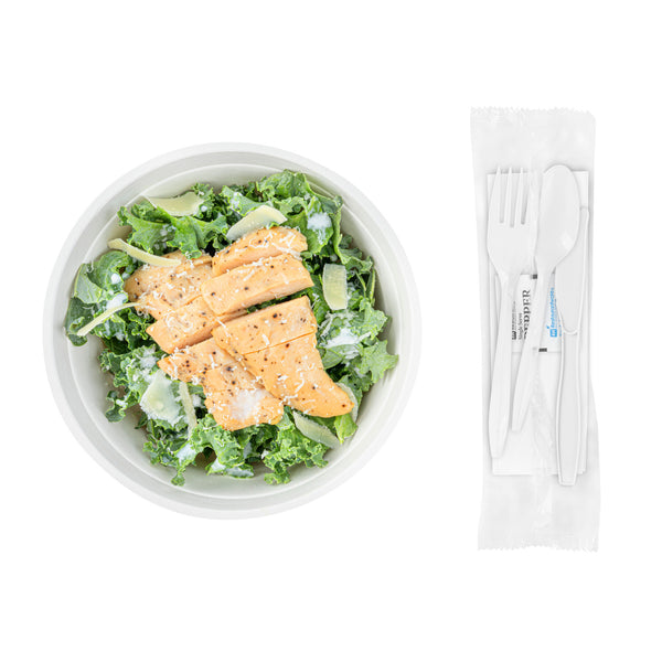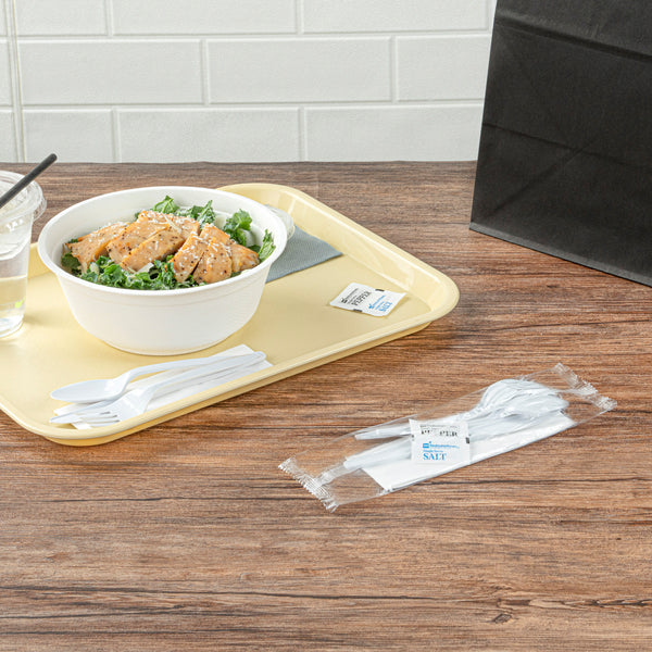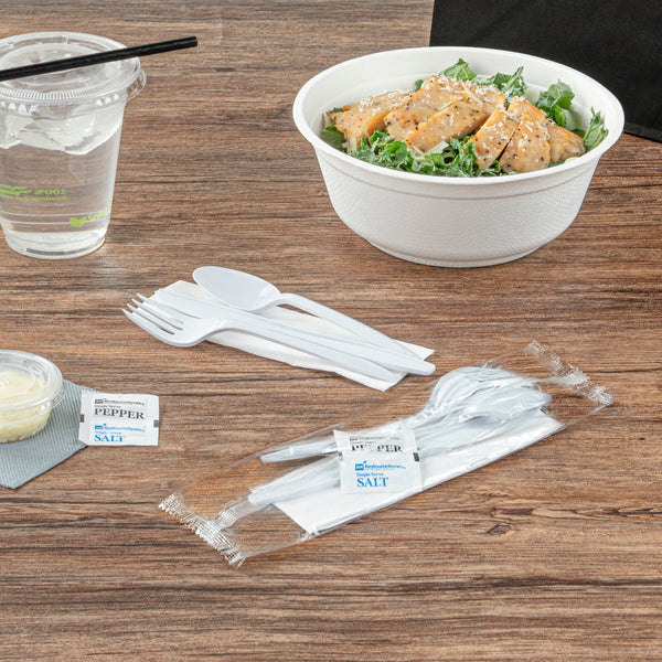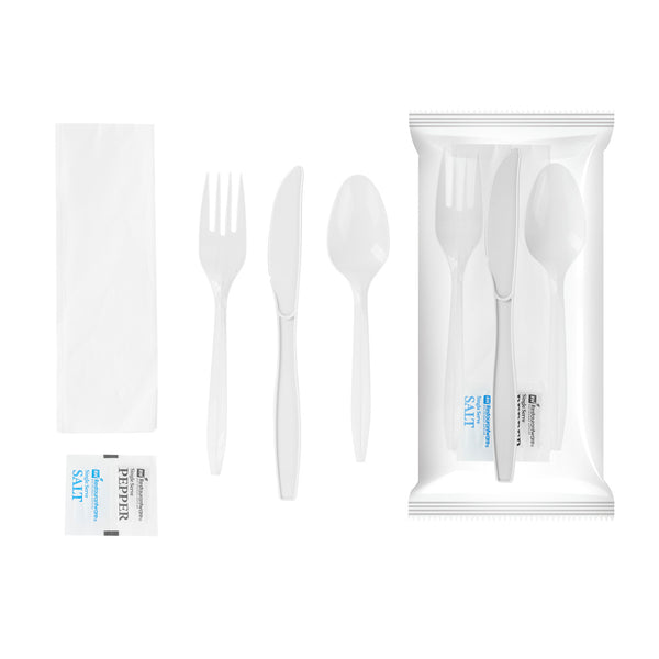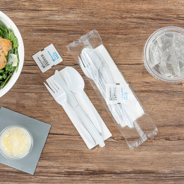 Ensure sanitary dining with individually wrapped cutlery sets. The Chef 101 Individually Wrapped Medium-Weight Polypropylene Cutlery Set provides a complete dining solution with a plastic fork, knife, spoon set, and a 1-ply 12-inch by 13-inch napkin, along with salt and pepper packets, making it ideal for take-out services. Individually wrapped in a paper bag, this set ensures cleanliness, promoting customer health and safety while maintaining the appeal of a wrapped plastic cutlery set. Crafted from medium-weight polypropylene, this disposable utensil set with condiments is perfect for light fare at catering events, balancing durability and cost-effectiveness. The classic white color complements various dining settings, whether for casual eateries or formal venues. Each order includes 500 Chef 101 Individually Wrapped Medium-Weight Polypropylene Cutlery Sets.
