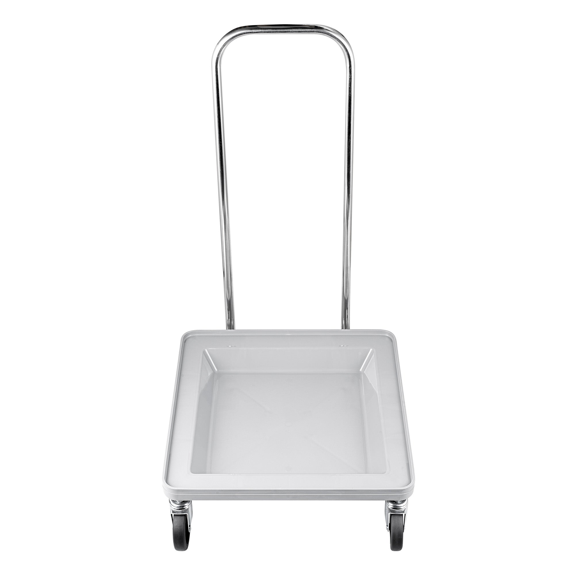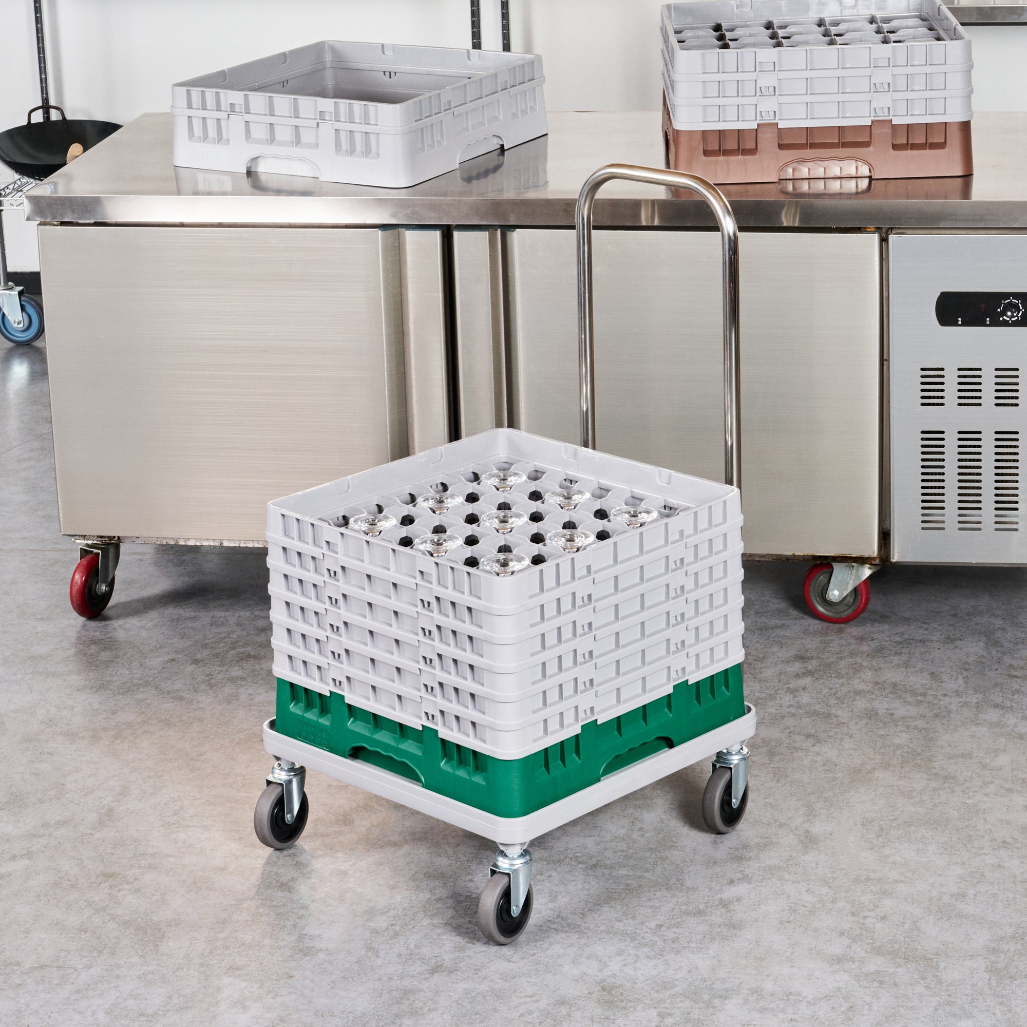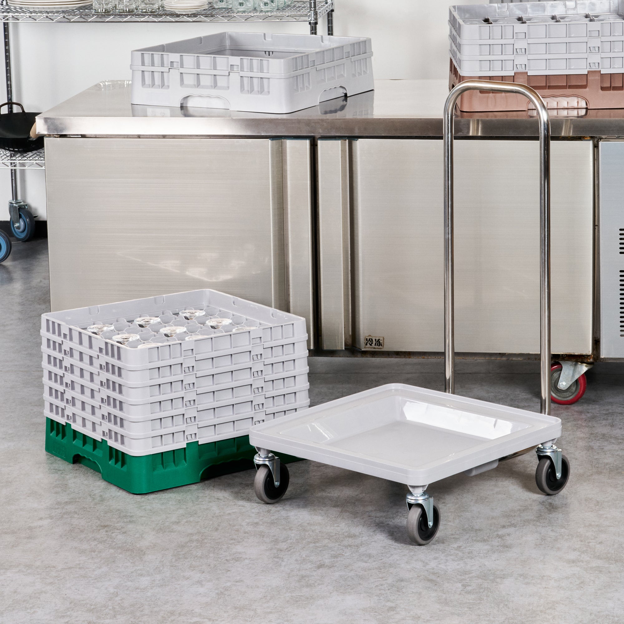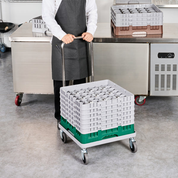 Revolutionize your kitchen operations with our Bundle: Clean Tek Professional 1 Gray Dish Rack Dolly and 1 Dolly Handle, designed for effortless dish transportation and storage. This dynamic duo includes a sturdy gray plastic dolly and a convenient handle, working in tandem to streamline your kitchen workflow. The dolly features four 4-inch casters, enabling smooth mobility across various surfaces, from kitchen floors to storage areas. Its indented surface securely holds compatible glass racks, averting accidents and ensuring secure transport. Constructed from premium plastic, this rack dolly offers long-lasting durability to withstand daily use in busy kitchen settings. The included dolly handle enhances maneuverability, allowing staff to easily guide the loaded dolly through tight spaces and around corners. When not in use, the compact design of the dolly, measuring 20.87 inches in length by 20.87 inches in width by 7.09 inches in height, allows for convenient storage in small spaces. Each order includes 1 gray dish rack dolly and 1 dolly handle.