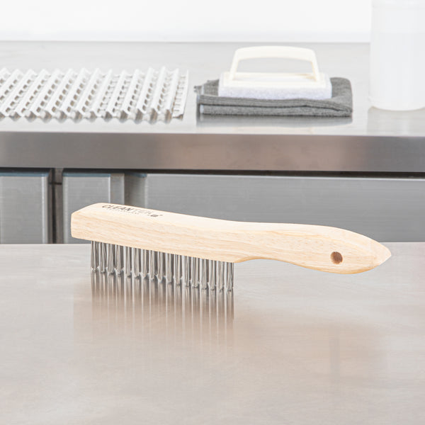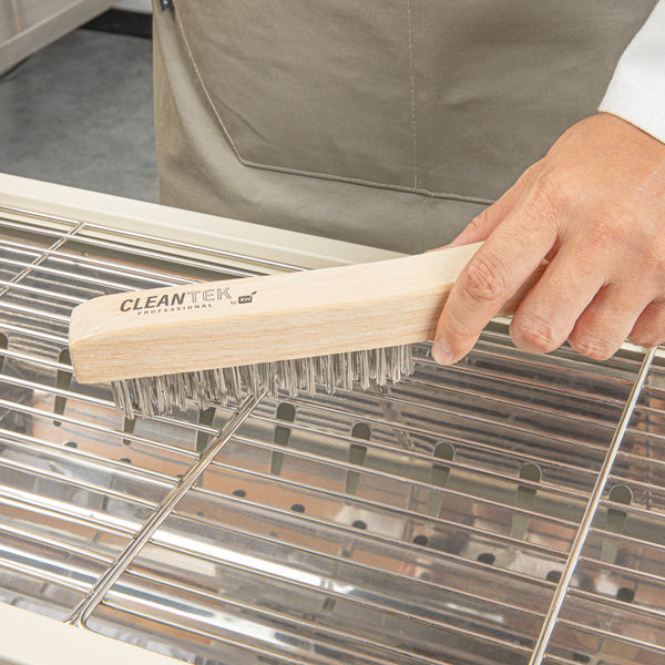 Transform your cleaning routine with our Clean Tek Professional 10 1/4-inch Stainless Steel Wire Bristle Grill / Oven Brush. The stainless steel bristles of this oven brush ensure resistance to rust and corrosion, providing reliable performance and longevity. Designed specifically for convenience, the ergonomic design of this grill brush reduces hand fatigue over prolonged use. With a curved handle, this grill cleaner brush offers a comfortable grip, allowing for easy maneuvering and thorough cleaning without contact with hot surfaces. The versatile design of this grill scrubber is ideal for removing corrosion from equipment and machinery, as well as cleaning threads, grills, and tiles. Measuring 10.24 inches in length, this pizza oven brush is compact yet highly effective. Sold in a 1 count box.