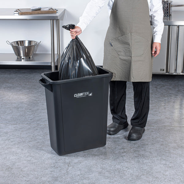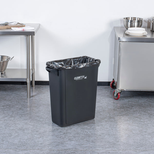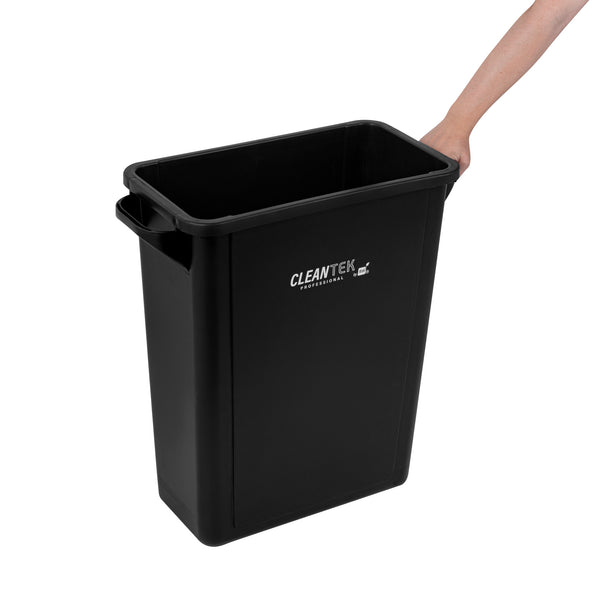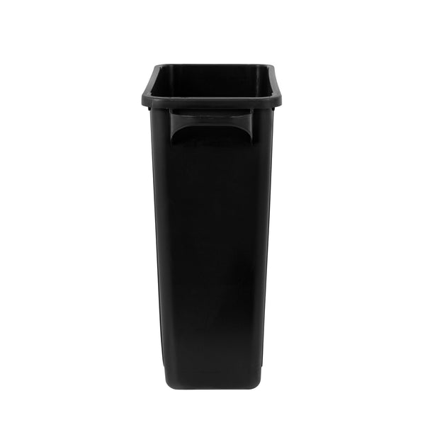 Elevate waste management at your establishment with our Clean Tek Professional 15-gallon Rectangle Black Plastic Slim Trash Can. This plastic bin features built-in side handles for easy lifting and maneuverability during waste disposal. Slim by design, this trash can fits seamlessly between furniture or equipment, making it perfect for high-traffic areas with limited space. Created from premium plastic, this garbage bin is durable and withstands heavy-duty use in any foodservice setting. With a 15-gallon capacity, this garbage can provides ample room for everyday waste while still being compact enough for smaller spaces. The classic black color of this outdoor trash can blends effortlessly with most decor styles. Measuring 24.02 inches in length by 10.75 inches in width by 24.72 inches in height, this trash bin can hold up to 15 gallons and is designed to maximize space efficiency. Sold in a 1 count box.
