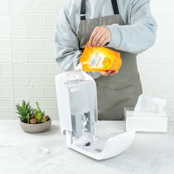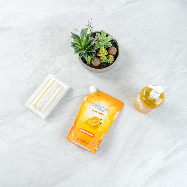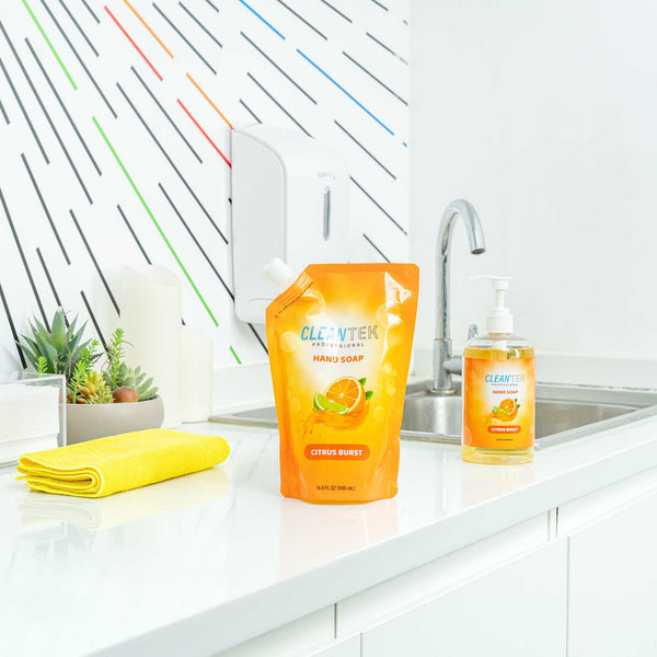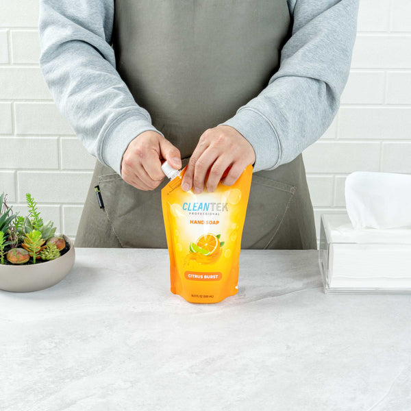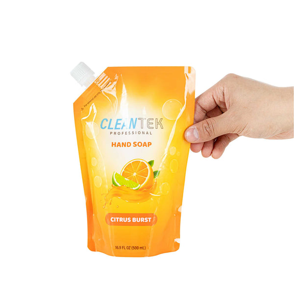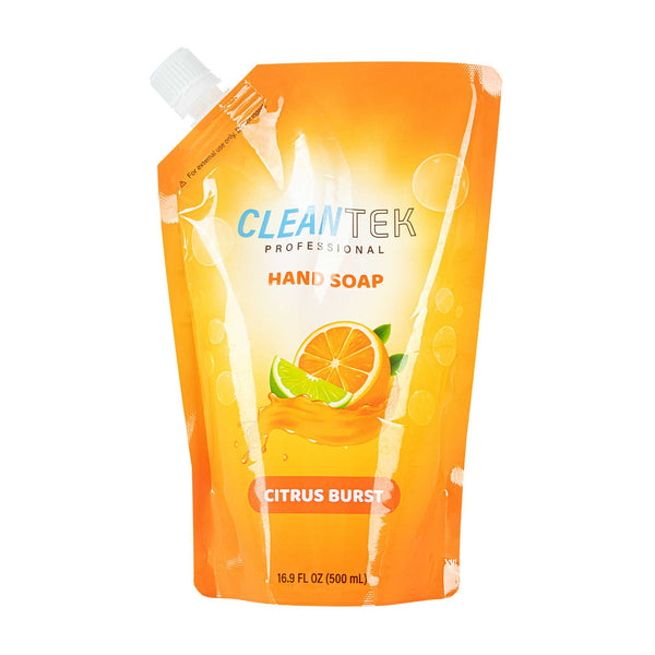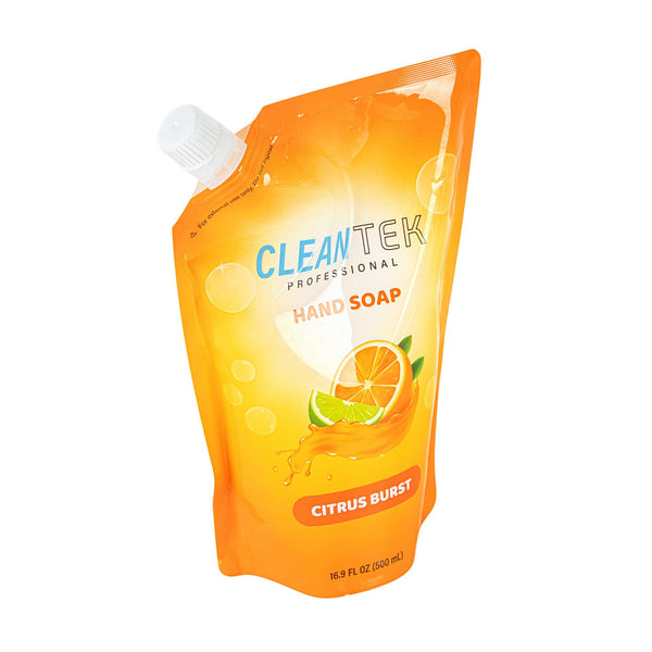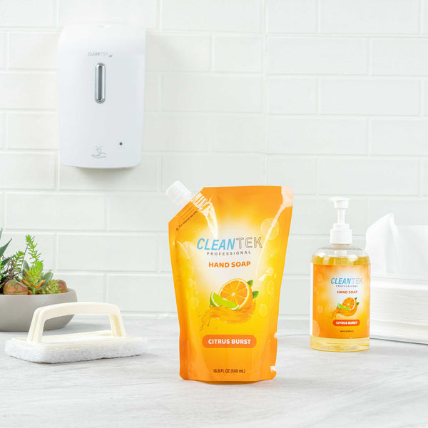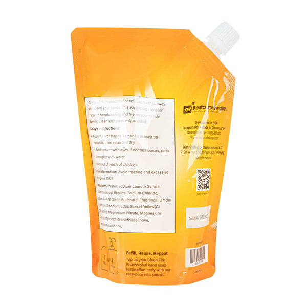 Enhance hygiene effortlessly with our liquid hand soap refill. The Clean Tek Professional Liquid Hand Soap Refill ensures hygienic handwashing in busy foodservice settings. With a generous 16.9 fluid ounces capacity, this hand washing soap refill minimizes the need for frequent replacements, making it ideal for high-traffic areas. Its soothing aloe scent enhances the washing experience while the Citrus Burst fragrance leaves hands with a refreshing aroma, essential for soap for restaurants. Measuring 3 inches in width, this chemical product easily integrates into standard liquid soap dispensers, facilitating seamless implementation in kitchens or restrooms. The moisturizing ingredients help prevent skin dryness, promoting consistent handwashing among staff. Choose this reliable solution to maintain cleanliness and safety in your establishment with each use. Each order includes 1 Clean Tek Professional Antibacterial Liquid Hand Soap Refill.