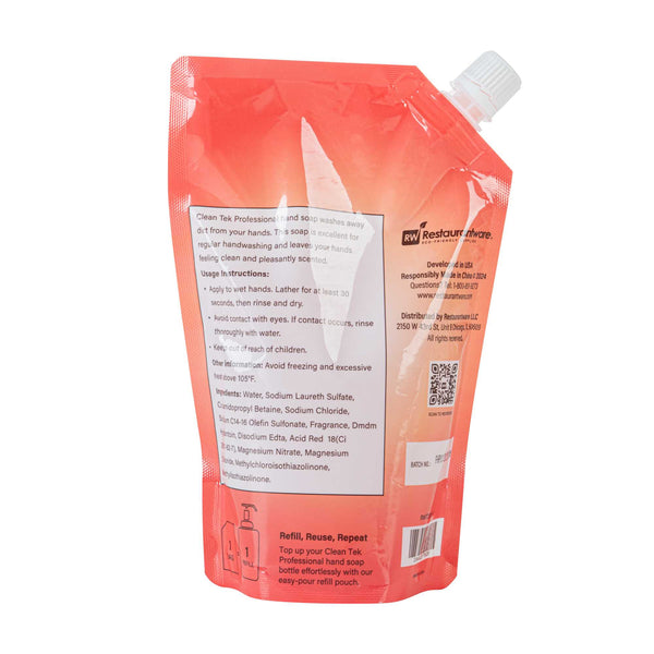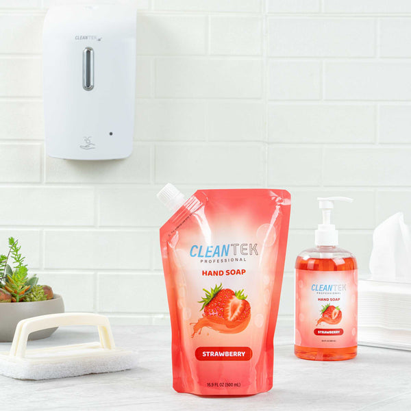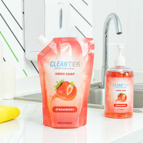 Ensure optimal hygiene with every wash. The Clean Tek Liquid Hand Soap Refill is designed with a soothing strawberry scent, enhancing the handwashing experience for guests and staff alike by promoting a calming atmosphere. With a generous capacity of 16.9 ounces per refill, this hand soap minimizes the frequency of restocking, making it ideal for high-traffic settings where efficiency is key. Crafted from chemical products, this liquid soap for dispensers is specifically formulated to provide robust cleansing action, ensuring reliable sanitation. Maximize your foodservice operation's cleanliness standards by incorporating this essential product. Each order includes 1 Clean Tek Liquid Hand Soap Refill.