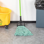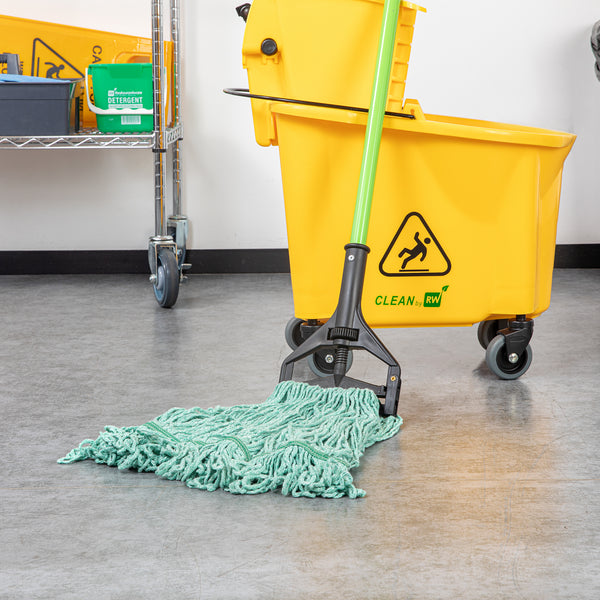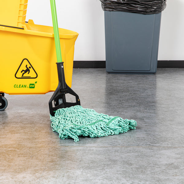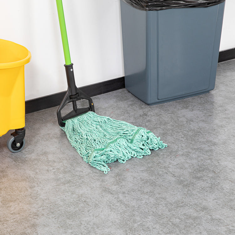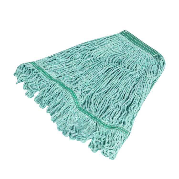 Effortlessly tackle cleaning tasks with our Clean Tek 16-ounce Green Cotton Blend Heavy Duty Wet Mop Head. This commercial mop head features a sturdy 1.25-inch wide headband that ensures a tight and reliable fit with compatible handles (SKUs: RWT1788K, RWT1789G, and RWT1790G), enhancing your cleaning experience. The looped end design of this wet mop head prevents fraying and extends its lifespan, providing more effective cleaning over time. Crafted from a premium blend of cotton and polyester, this washable mop head offers superior dirt pick up and exceptional absorbency, making it ideal for ensuring spotless floors. This mop head replacement is machine washable, allowing for easy cleaning and repeated use, delivering long-lasting performance. Each green mop head ensures your floors dry faster without leaving any streaks behind. Measuring 17.72 inches in length by 5.98 inches in width by 1.97 inches in height, this mop head has a capacity of 16 ounces. Sold in a 1 count box. Handles are available and sold separately.