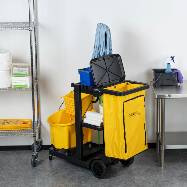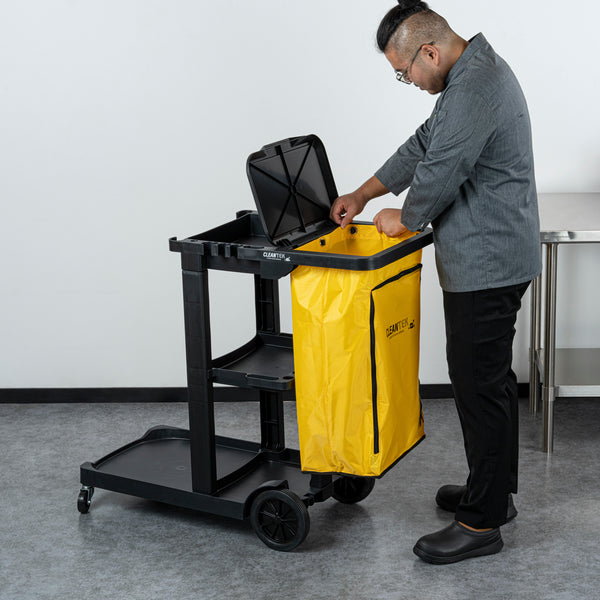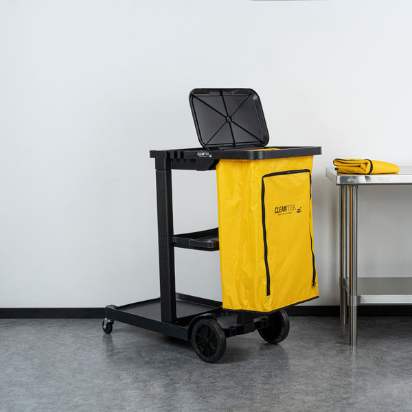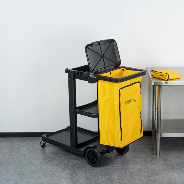 Efficiently manage waste collection and organization with our Clean Tek Professional 18-gallon Yellow Plastic Bag. This laundry bag is compatible with our collection of Clean Tek Professional janitor carts to streamline your cleaning process. Featuring a convenient side zipper, this heavy-duty plastic bag allows for effortless emptying without the need to lift. With metal-reinforced hanging holes, this janitor cart bag provides exceptional durability and secure attachment, ensuring reliable performance even with heavy loads and frequent use. This large plastic bag is easy to install and remove from your janitorial cart, streamlining the process of changing outliners and making maintenance more efficient. With a yellow finish, this plastic bag supports color-coded waste segregation, making it easy to identify and organize different types of waste. Measuring 14.96 inches in length by 10.63 inches in width by 27.17 inches in height, this 18-gallon janitor cart bag offers ample room for various applications. Sold in a 1 count box. Janitor carts are available and sold separately.