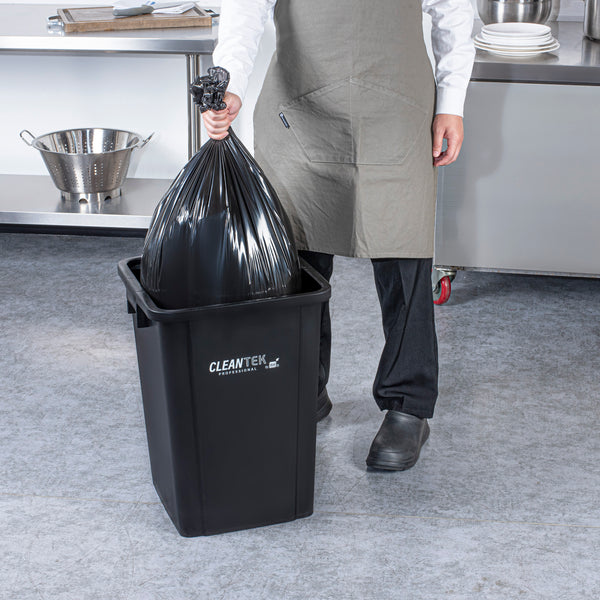 Optimize waste management with our Clean Tek Professional 19-gallon Square Black Plastic Trash Can, designed to elevate efficiency in your foodservice establishment. Made from premium HDPE plastic, this durable trash bin withstands heavy-duty use, ensuring longevity. The square design of this trash can ensures it fits neatly into tight corners, maximizing space efficiency in any room. Providing ample space for high-volume waste disposal, this garbage bin boasts a 19-gallon capacity. Pair this garbage can with a compatible lid (SKU: RWT2018B) to keep contents securely enclosed, preventing spills and containing odors. The classic black color of this outdoor trash can blends in seamlessly with most decor, enhancing the aesthetic appeal of your environment. Measuring 15.95 inches in length by 16.06 inches in width by 21.26 inches in height, this plastic bin accommodates up to 19 gallons. Sold in a 1 count box. Lid is available and sold separately.