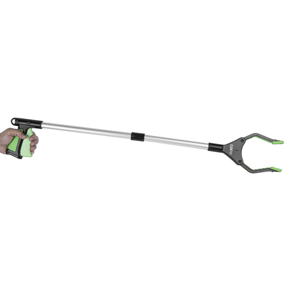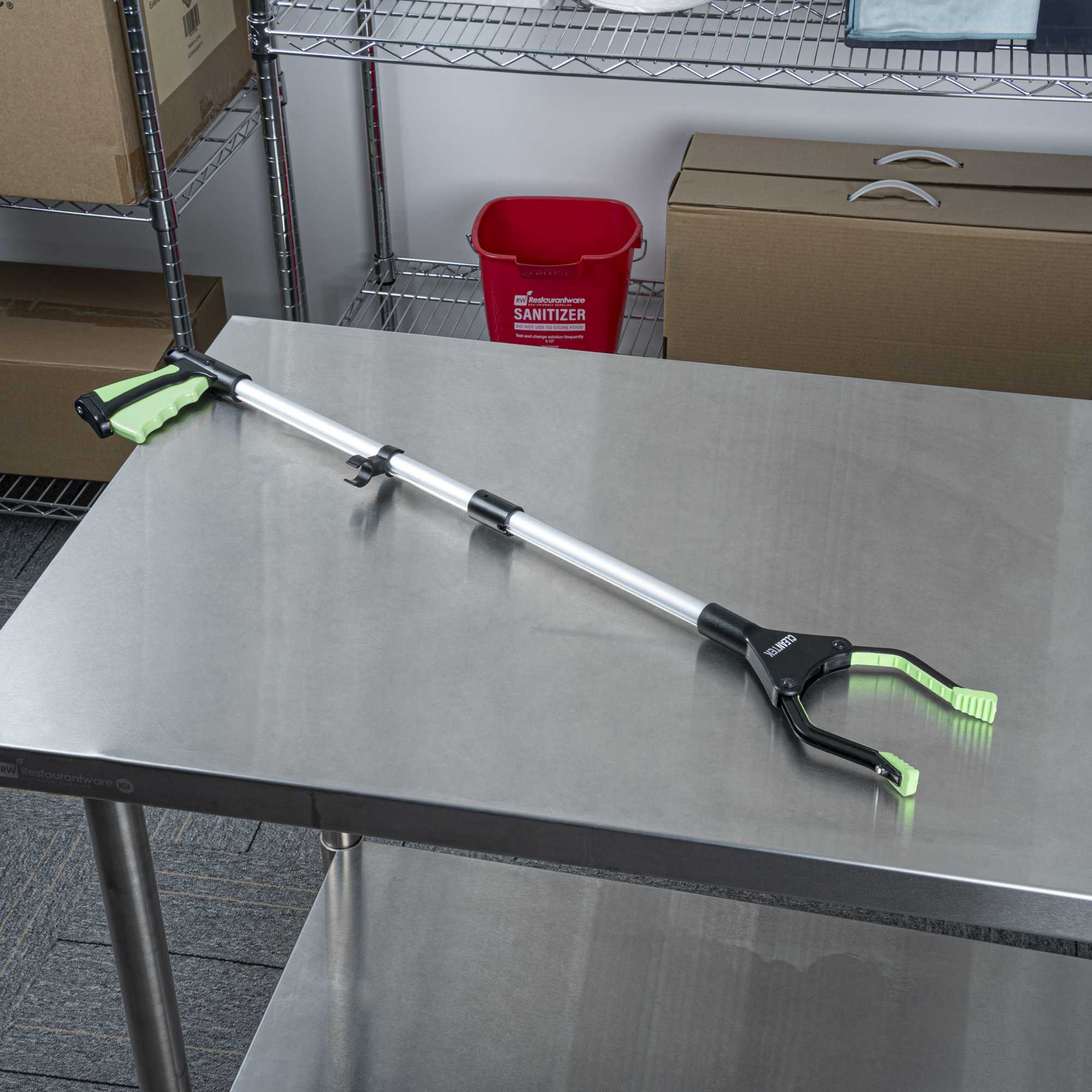 Keep areas spotless using our Clean Tek Professional 2-Fold Pick-Up Reaching Grabber Tool. This foldable trash grabber features a 360° rotating jaw for precise trash retrieval from tight or hard-to-reach spaces. Designed with a magnetic tip, this garbage grabber easily picks up light metal debris like utensils, eliminating the need for bending. The rubber-coated jaws on this plastic trash grabber provide a secure grip to hold narrow or small items with confidence. Each grabber features a 2-fold design allows for quick collapsing and fast deployment. Made from durable plastic and aluminum alloy, this folding litter picker is robust for repeated use. Ideal for restaurants, warehouses, commercial refrigerators, or foodservice pantries, this magnetic litter picker can securely hold up to 4.4 pounds of weight. Measuring 32.28 inches in length and 15.74 inches when folded, with a 4.9 inch clip opening, this trash claw is compact and convenient for storage. Sold in a 1 count box.