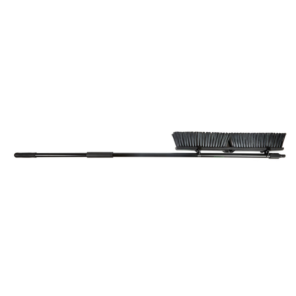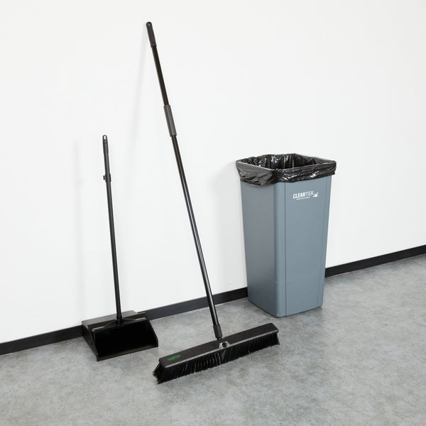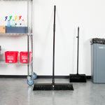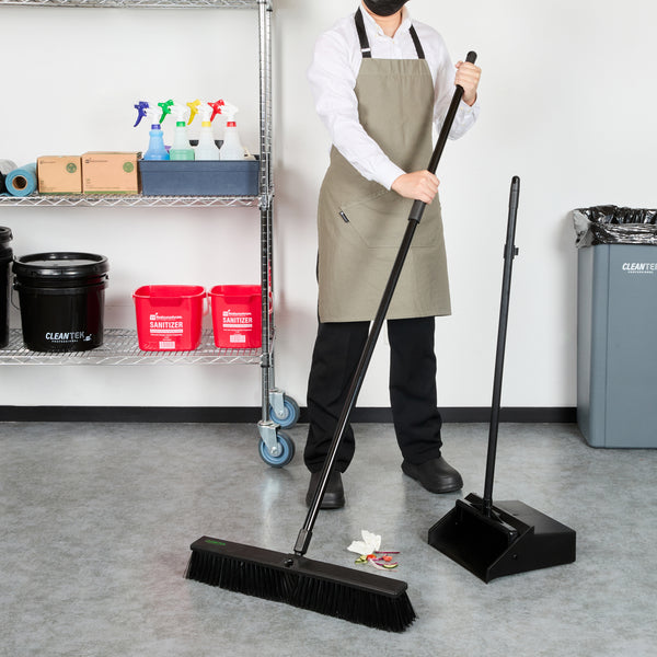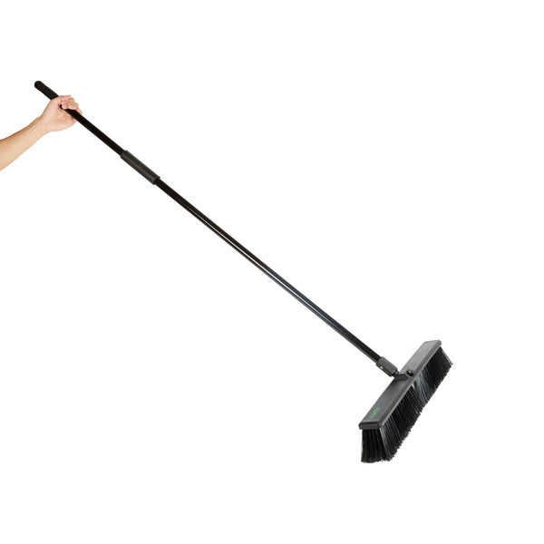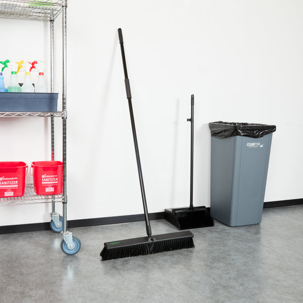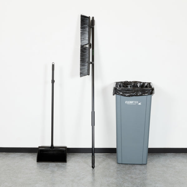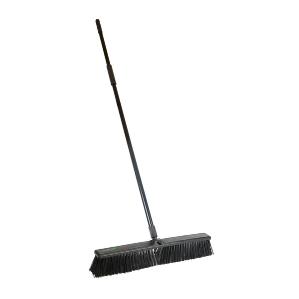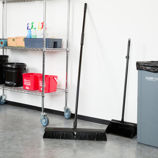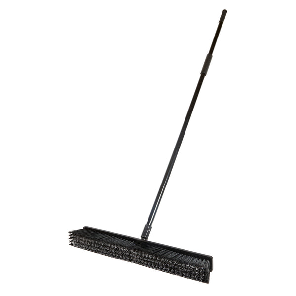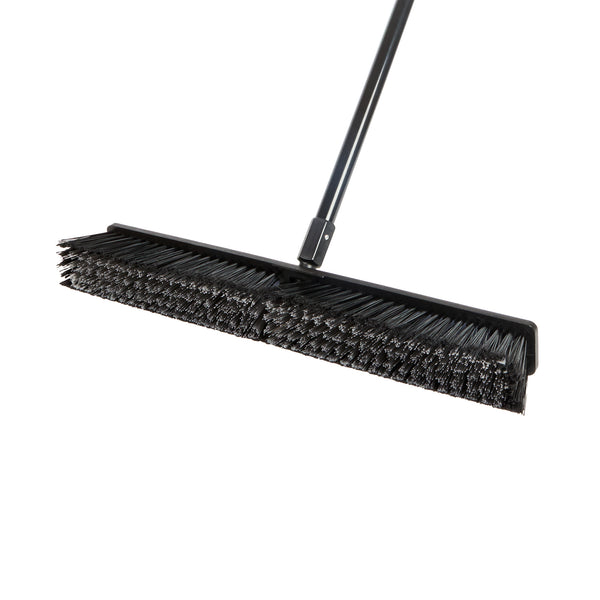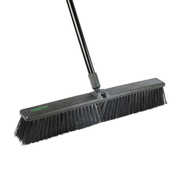 Keep your space spotless with our Clean Tek Professional 23 1/2-inch Black Plastic Push Broom. Equipped with medium flagged bristles, this heavy-duty push broom provides versatile cleaning performance, effectively capturing dust and debris from a variety of surfaces while maintaining durability for general-purpose use. The plastic bristles on this push broom are durable, providing long-lasting performance on both indoor and outdoor surfaces. The plastic block of this dust broom features two handle attachments, allowing you to swap the broom handle sides if you find the bristles are wearing unevenly. With a 59-inch steel handle, this sweeper broom offers a long reach and maneuverability, allowing you to easily access and clean large or hard-to-reach areas. Designed with an ergonomic handle, this broomstick reduces hand fatigue over prolonged use. Measuring 62.21 inches in length by 23.62 inches in width by 2.36 inches in height, this garage broom is perfectly sized for extensive cleaning tasks. Sold in a 1 count box.