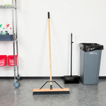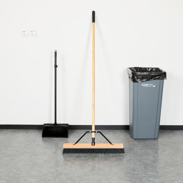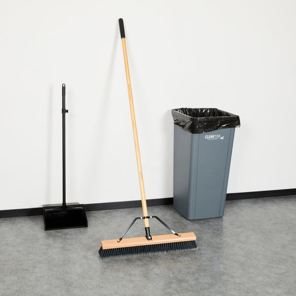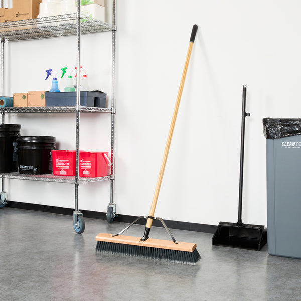 Equip your cleaning arsenal with our Clean Tek Professional 24-inch Contractor / Push Broom. Featuring medium flagged plastic bristles, this dust broom effectively captures fine particles and larger debris from various surfaces, ensuring a thorough clean every time. For added comfort and reach, this push broom comes with a 60-inch wood handle, allowing you to sweep hard-to-reach areas without bending or straining. This heavy-duty broom boasts an ergonomic design and ensures comfortable handling, ideal for extended use. With a 24-inch broom head, this broomstick effectively covers large areas, making it ideal for both indoor and outdoor sweeping tasks. The metal braces on this sweeper broom prevent unthreading, providing a secure and stable connection between the handle and bristles for dependable performance. With total dimensions measuring 64.17 inches in length by 25.59 inches in width by 3.15 inches in height, this contractor broom is the perfect size for large-scale cleaning jobs. Sold in a 1 count box.