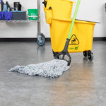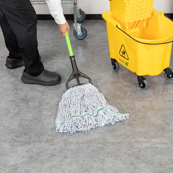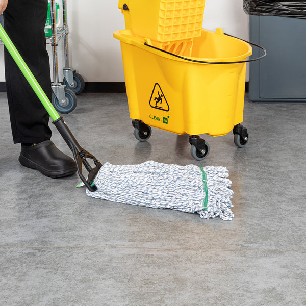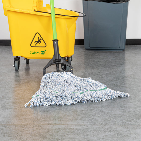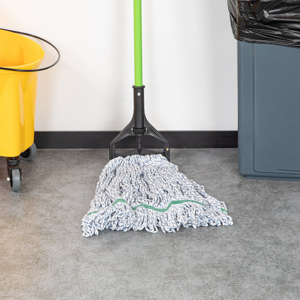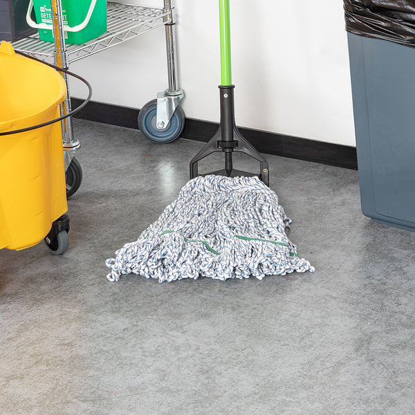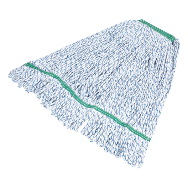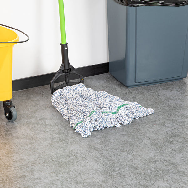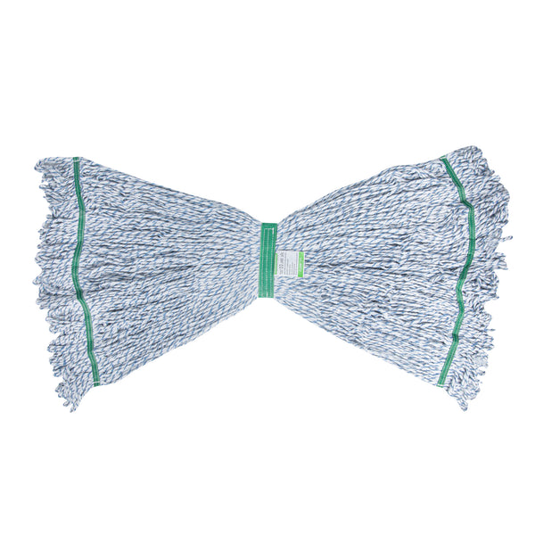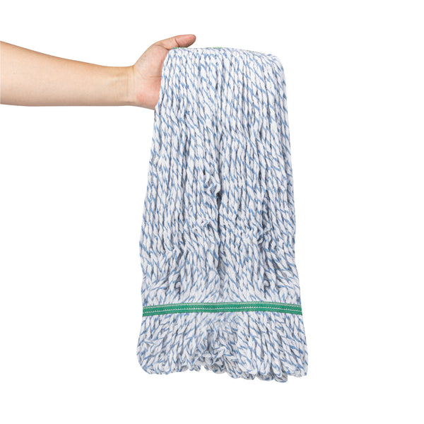 Enhance your cleaning efficiency with our Clean Tek Professional 24-ounce Blue Cotton Blend Finishing Wet Mop Head. Featuring a 1.25-inch wide headband, this commercial mop head ensures a secure fit with its compatible handle (SKUs: RWT1788K, RWT1789G, and RWT1790G), making it perfect for heavy-duty cleaning tasks in any foodservice establishment. The looped end design of this wet mop head increases durability and prevents fraying, providing a longer lifespan and more effective cleaning performance. Crafted from a premium blend of cotton and polyester, this washable mop head offers superior dirt pick up and absorbency, making it ideal for efficient and thorough cleaning. This blue mop head is machine washable, allowing for easy cleaning and repeated use, ensuring long-lasting performance. Plus, this mop head ensures that your floors dry faster without streaking, making it an indispensable tool for maintaining cleanliness in high-traffic areas. Measuring 19.69 inches in length by 5.98 inches in width by 1.97 inches in height, this mop head replacement has a capacity of 24 ounces. Sold in a 1 count box. Handles are available and sold separately.