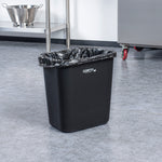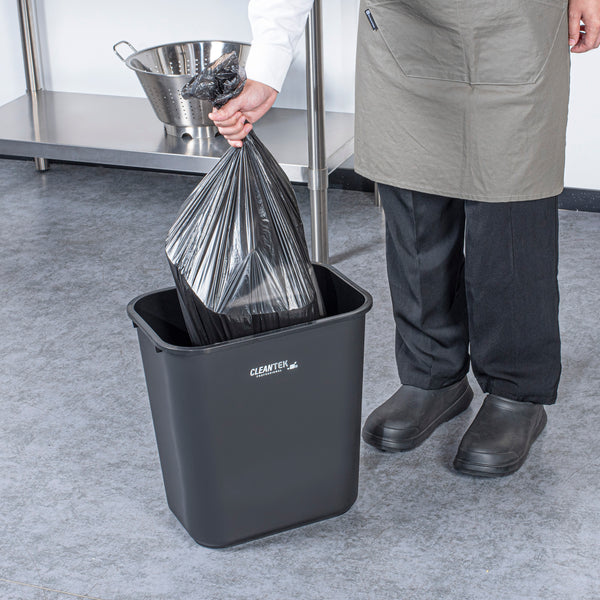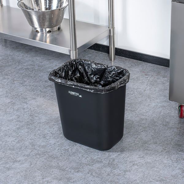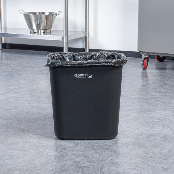 Maximize space and efficiency with a sleek, durable solution. The Clean Tek Professional Space-Saving Trash Can offers a substantial 28-quart (7-gallon) capacity, ideal for accommodating large volumes of waste and minimizing emptying frequency in high-traffic areas. Its rectangular design fits snugly against walls or under counters, making it the perfect trash can for optimizing tight kitchen corners. Constructed from premium plastic, this garbage bin withstands daily use in busy environments without compromising performance. The elegant black finish not only complements a variety of interior decors but also conceals dirt, maintaining a cleaner appearance. Measuring 14.5 inches in length, this rectangular wastebasket is suited for indoor commercial waste management in restaurants, cafes, and more. Enhance your space with this indispensable waste solution and maintain cleanliness effortlessly. Each order includes 1 Clean Tek Professional Space-Saving Trash Can.