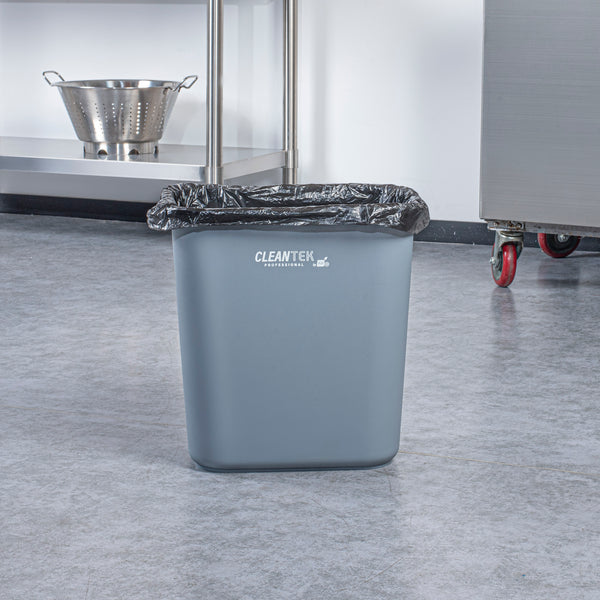 Optimize your waste management process with a space-saving solution. The Clean Tek Professional Space-Efficient Gray Plastic Rectangular Trash Can boasts durable plastic construction, ensuring long-lasting use even in high-traffic areas of your restaurant or office. Its 28-quart capacity accommodates substantial waste, minimizing the frequency of emptying and enhancing operational efficiency. This rectangular trash can is designed to fit seamlessly against walls or under counters, maximizing space in tight kitchen corners. The neutral gray finish blends effortlessly with various interior decors while also concealing dirt, making it an ideal office wastebasket. The premium construction withstands the demands of heavy-duty foodservice environments, providing reliable performance. Its smooth surface facilitates easy cleaning and maintenance, ensuring hygiene standards are consistently met. Each order includes 1 Clean Tek Professional Space-Efficient Gray Plastic Rectangular Trash Can.