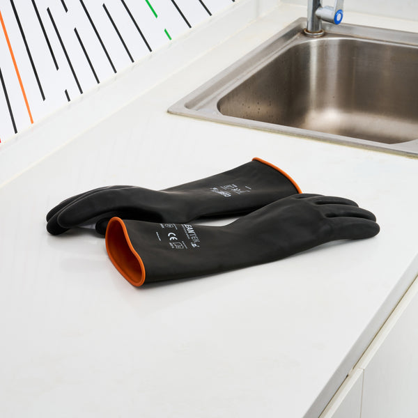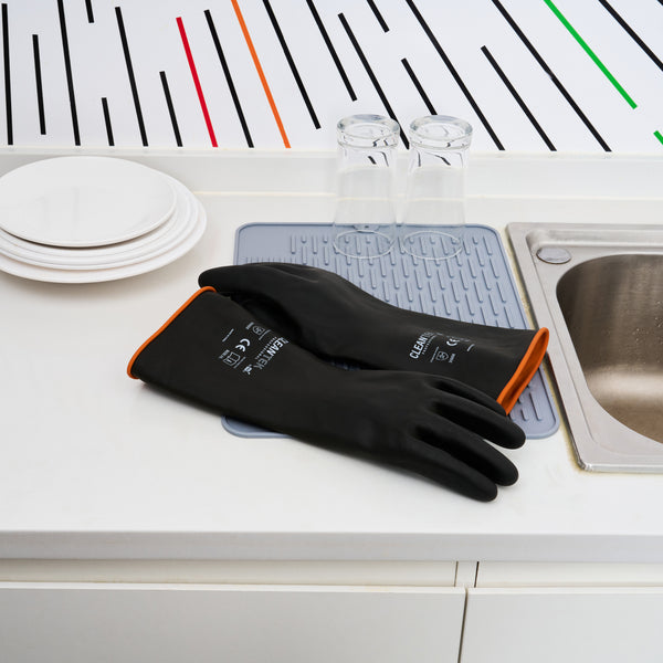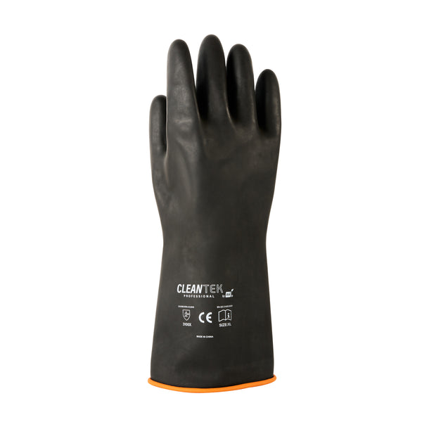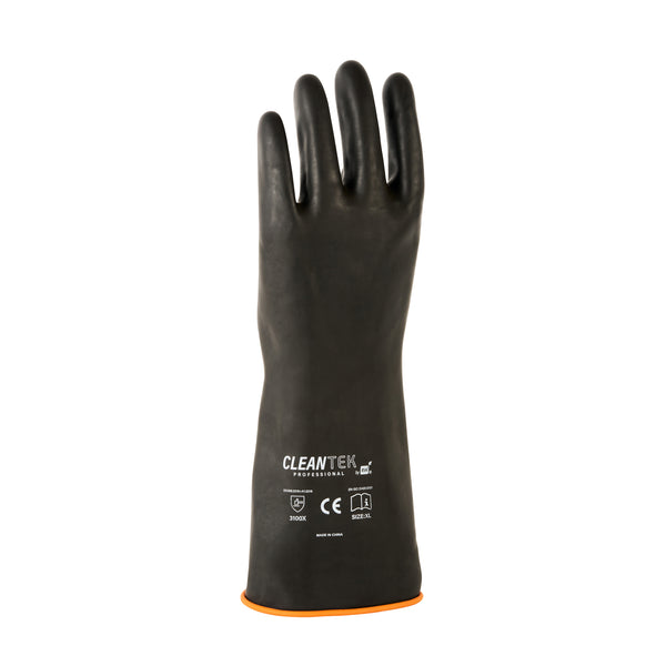 Ensure safe food handling with reliable protective gear. The Clean Tek Professional Chemical Resistance Industrial Rubber Glove offers enhanced chemical resistance, providing a secure way to handle food, acids, and alkalis. These industrial rubber gloves feature a rolled cuff that prevents slips, ensuring uninterrupted task handling for culinary professionals. Their heavy-duty design offers extra protection against cooking spills, making them an essential tool for restaurant kitchens. Measuring 13.78 inches in length, these gloves are crafted from durable rubber, giving them a secure grip and long-lasting performance in demanding environments. Ideal for use as a rubber work glove, they help maintain safety and efficiency in foodservice operations. Equip your kitchen staff with a dependable chemical resistant glove for enhanced safety and productivity. You will receive 1 pair of gloves per order.