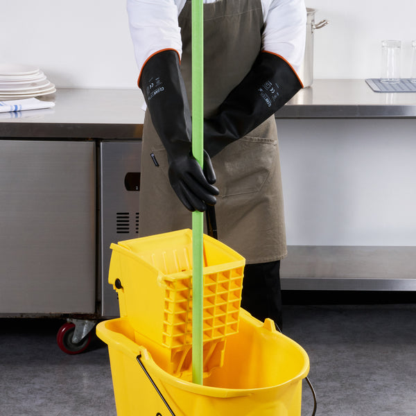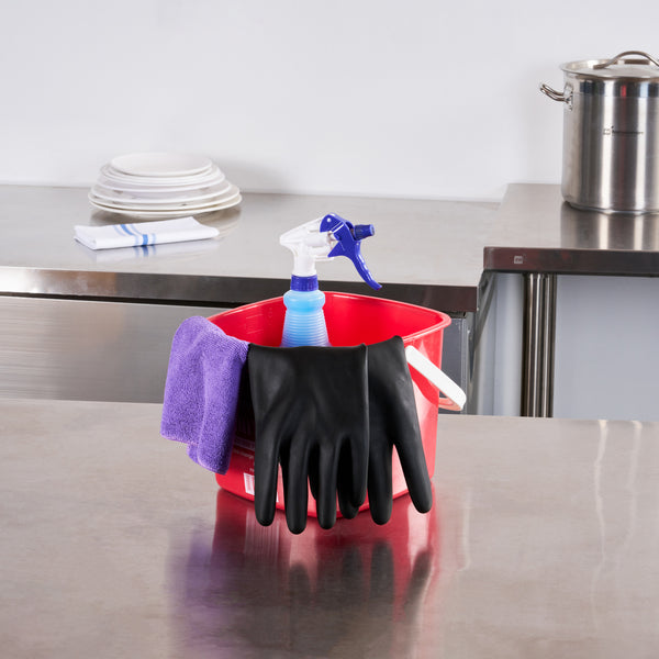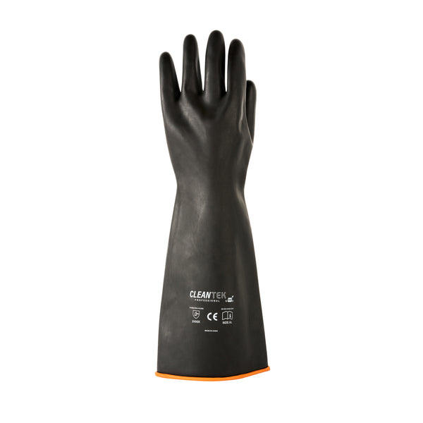 Safeguard your team with advanced hand protection during demanding tasks. Clean Tek Professional Chemical Resistance Black Rubber Gloves offer a robust 30 mil thick latex construction, providing exceptional chemical resistance that ensures safe handling of cleaning agents in food preparation areas. These heavy duty work gloves are designed with an unlined interior, delivering a comfortable fit and enhanced tactile sensitivity, which facilitates precise grip and control, even when handling greasy foods. Measuring 17 3/4 inches in length, they provide extended coverage up to the forearm, effectively protecting against accidental splashes. Crafted from rubber, these gloves support eco-friendly disposal practices, aligning with sustainable foodservice operations. Perfect for various applications, from kitchen cleaning to dishwashing, these black rubber gloves ensure durability and long-lasting use. Each order includes 10 Clean Tek Professional Chemical Resistance Black Rubber Gloves.