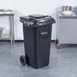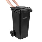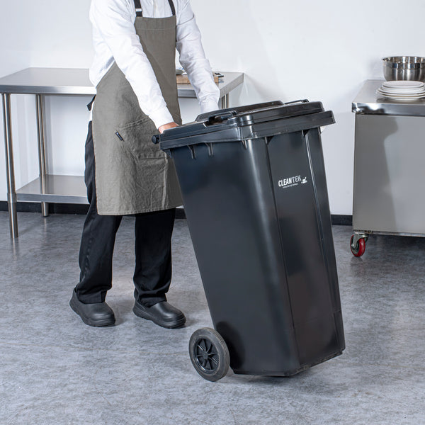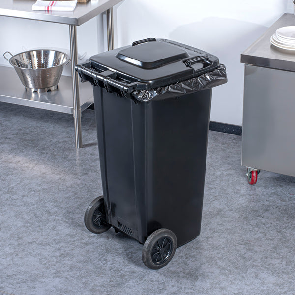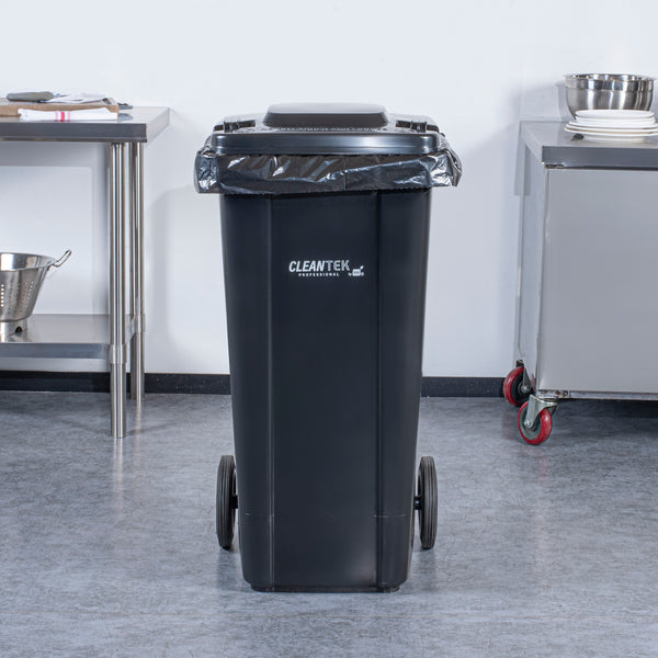 Elevate your waste management solutions with our Clean Tek Professional 32-gallon Rectangle Black Plastic Wheeled Trash Can. This trash can with wheels features a hinged lid to contain odors and maintain a tidy appearance, ensuring waste is kept out of sight and enhancing cleanliness in any space. Pair this rolling trash bin with the compatible step-on attachment (SKU: RWT2030S) for hands-free operation, making waste disposal effortless and hygienic. Equipped with heavy-duty wheels, this plastic bin can easily be maneuvered across various surfaces, providing convenience during transportation and disposal. The ergonomic molded-in handle of this outdoor trash can offers a comfortable grip and effortless maneuverability, ensuring reliable steering and enhanced control for both pushing and pulling. Made from premium plastic, this rolling garbage can is durable and withstands heavy-duty use at your foodservice establishment. Boasting a 32-gallon capacity, these rolling garbage bins are perfect for high-volume waste disposal, making them ideal for busy environments where frequent emptying is not feasible. The classic black color of this trash cart with wheels blends in with most decor. Measuring 22.44 inches in length by 18.9 inches in width by 37.4 inches in height, this trash bin with wheels can hold up to 32 gallons. Sold in a 1 count box. Step-on attachment is available and sold separately.