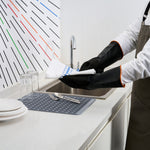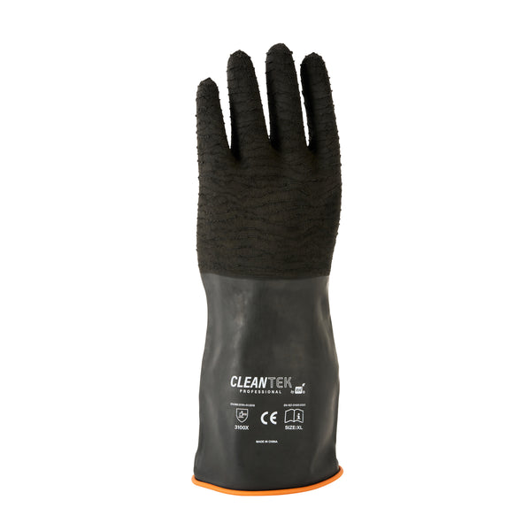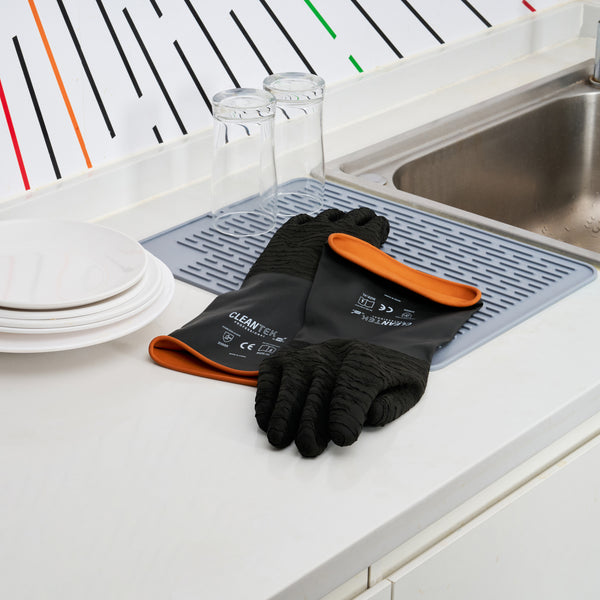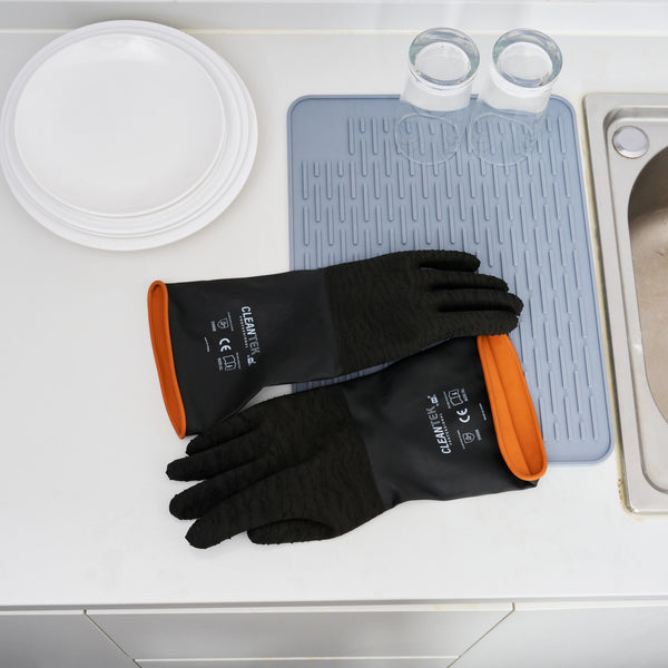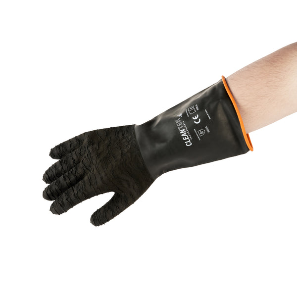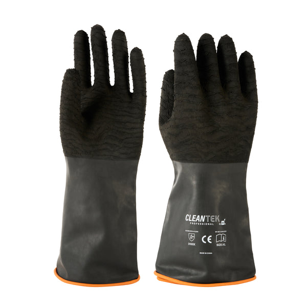 Ensure superior protection with Clean Tek Chemical-Resistant Heavy-Duty Rubber Gloves. These heavy-duty rubber gloves boast a 35 mil thick latex construction, providing robust protection against chemicals for unmatched safety during handling. With their chemical-resistant gloves design, they ensure safe handling of cleaning solutions, vital for maintaining operational safety in foodservice environments. The non-slip design enhances grip, reducing the risk of accidents, while their oil-resistant gloves feature protects surfaces from greasy spills, making them ideal for kitchen settings. An unlined interior allows for easy cleaning and quick drying, maintaining hygiene standards crucial for food processing. These gloves also feature a recyclable design, supporting environmentally conscious operations. Their impressive 13 3/4 inches length provides extended coverage, ensuring protection for hands and forearms. Each order includes 10 Clean Tek Chemical-Resistant Heavy-Duty Rubber Gloves.