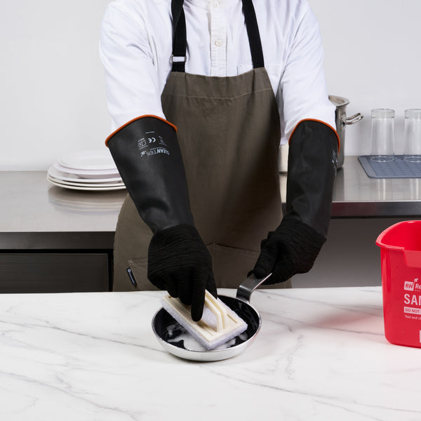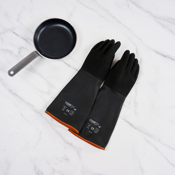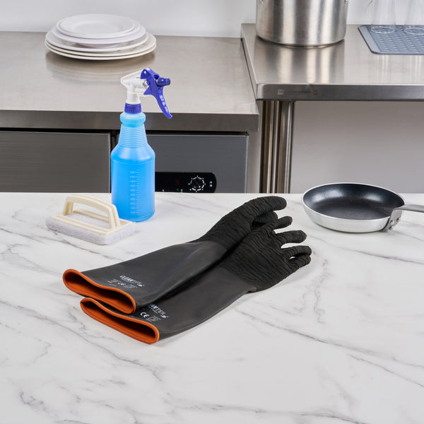 Protect your hands with ultimate safety in demanding environments. Clean Tek Professional Chemical-Resistant Rubber Gloves provide enhanced protection with a robust 35 mil thickness, ensuring durability against harsh chemicals and abrasions. Their non-slip design offers a secure grip, significantly reducing the risk of accidents when handling slippery items, making them indispensable chemical resistant gloves for foodservice professionals. An unlined interior enhances tactile sensitivity, allowing chefs and janitorial staff to perform precise tasks safely. The gloves' oil resistance maintains their appearance in greasy kitchens, ensuring these heavy duty rubber gloves remain reliable even in the most challenging conditions. With an extended length of 17 3/4 inches, these waterproof safety gloves provide additional forearm protection against splashes. Each order includes 10 Clean Tek Professional Chemical-Resistant Rubber Gloves.