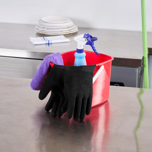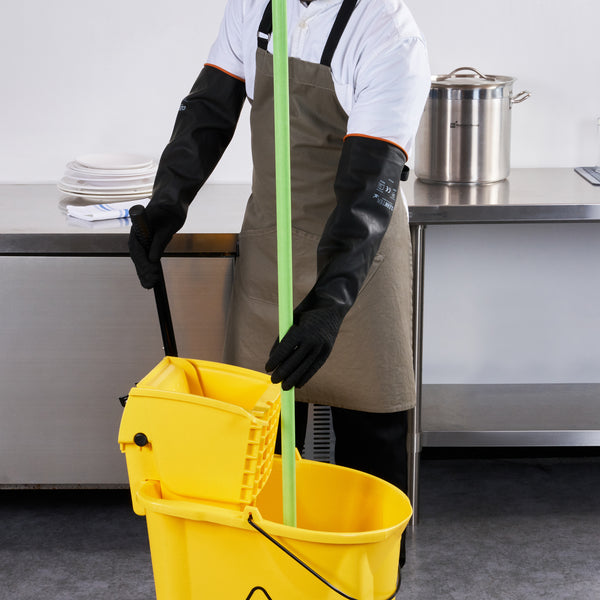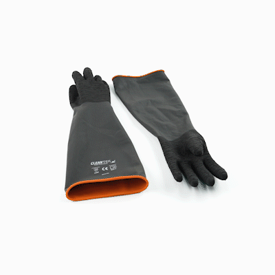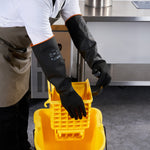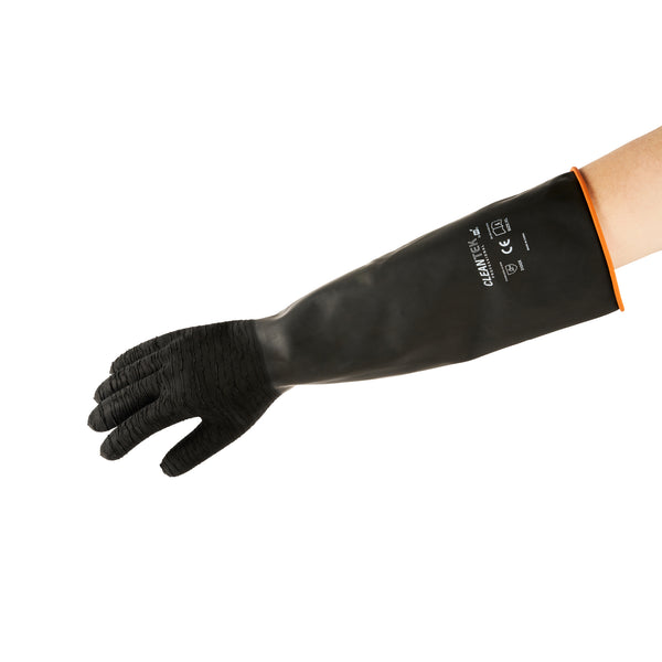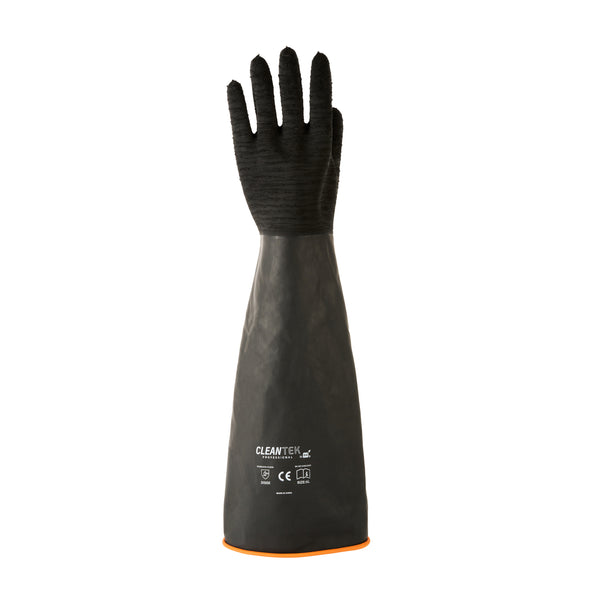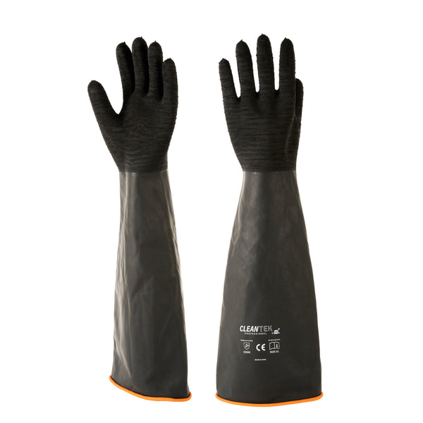 Ensure safety and efficiency with robust protection during heavy-duty tasks. Clean Tek Professional Black Rubber Chemical Resistant Gloves provide superior chemical resistance, ensuring safe handling of kitchen acids and protecting hands from abrasions. With their anti-slip design, these gloves deliver a secure fit, enabling seamless task handling and reducing the risk of accidents, making them ideal as chemical resistant gloves. Measuring an extended 21.65 inches in length, they offer heavy-duty coverage that safeguards against spills and splashes, making them essential industrial gloves in demanding environments. Constructed from 35-mil thick latex, these gloves enhance tactile sensitivity with their unlined design, allowing for precise handling of materials. Suitable for various applications, from handling chemicals to dishwashing in commercial kitchens, these gloves withstand rigorous use, providing the reliable durability needed for heavy-duty gloves. You will receive 1 pair of gloves per order.