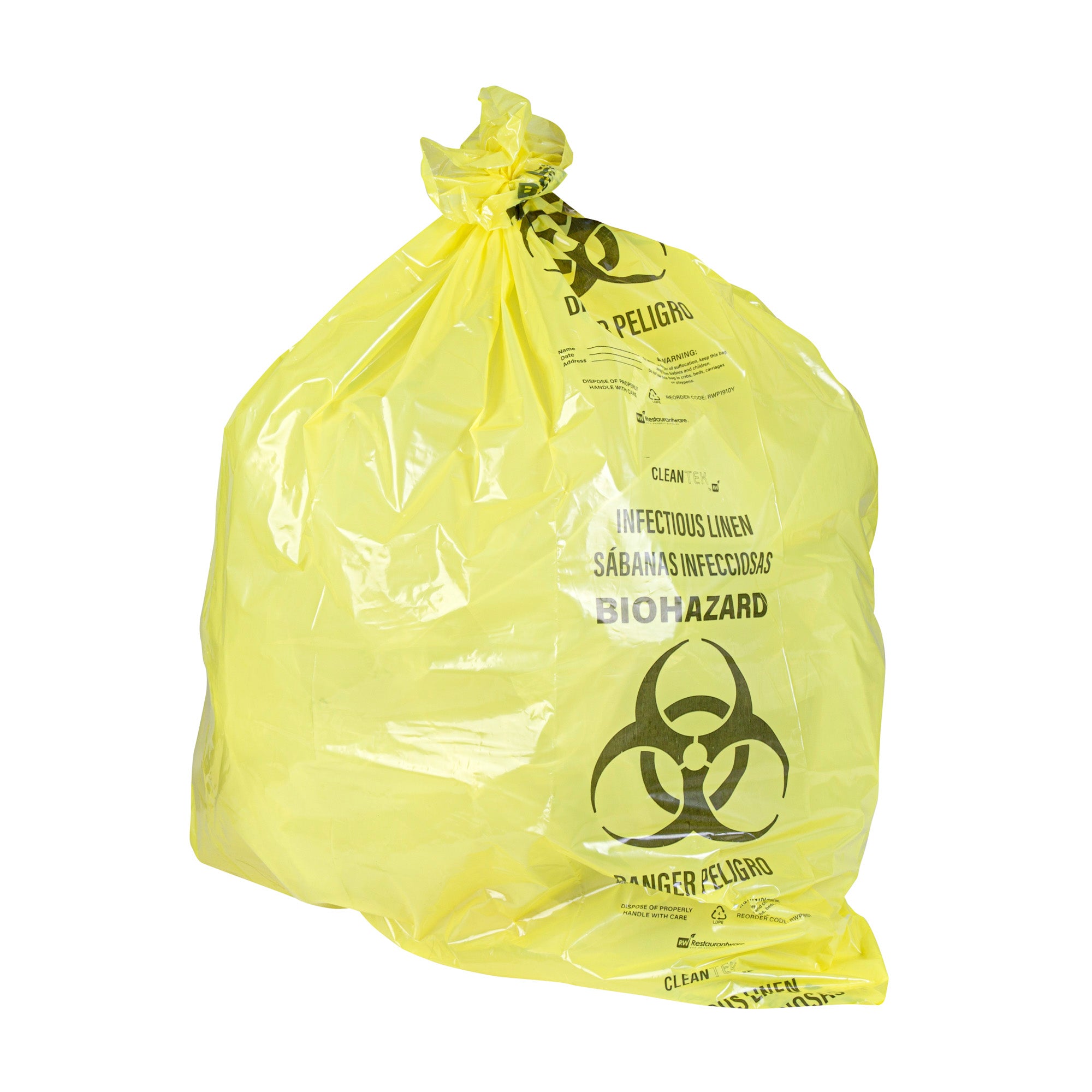 Ensure safety and compliance with leakproof biohazard trash bags. Clean Tek Professional Puncture-Resistant Biohazard Trash Bags are designed with a biohazard symbol in both English and Spanish, enhancing safety in healthcare settings by clearly indicating hazardous waste. These infection control bags feature a puncture-resistant design that prevents tears from sharp objects, reducing the risk of leaks and spills and maintaining cleanliness. With a flat seal bottom, these bags ensure equal weight distribution, enhancing stability and preventing spills. Made from LLDPE, a durable plastic material, these 45-gallon bags are ideal for containing and disposing of hazardous waste in hospitals, laboratories, and medical facilities. The yellow color-coded design facilitates easy identification and separation of biohazard waste, aiding in efficient safety protocols. Equip your facility with these medical waste trash bags to improve waste management and protect staff. Each order includes 50 Clean Tek Professional Puncture-Resistant Biohazard Trash Bags.