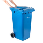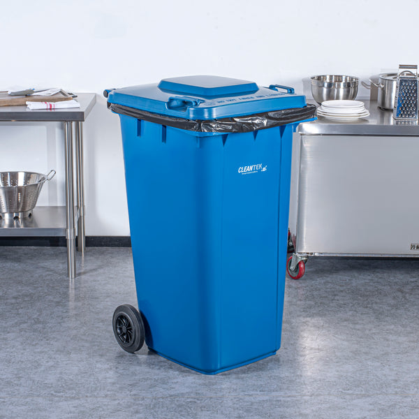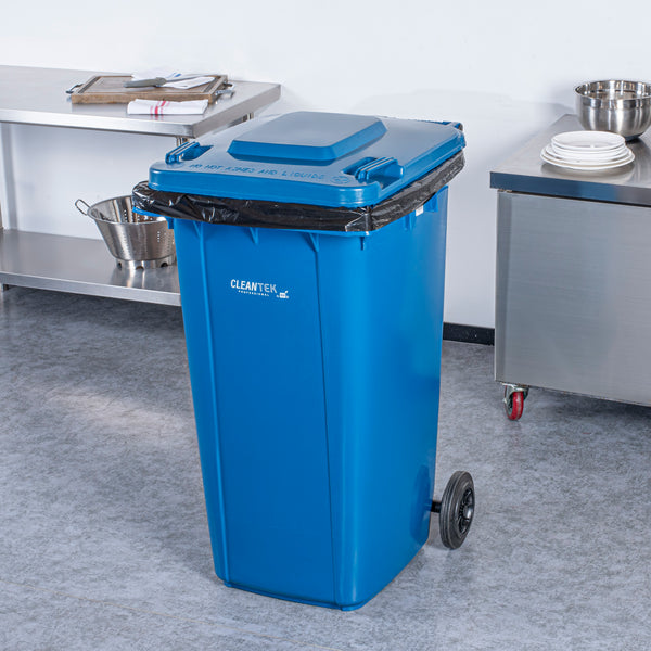 Enhance cleanliness in any space with our Clean Tek Professional 64 gal Rectangle Blue Plastic Wheeled Trash Can. This trash can with wheels is equipped with a hinged lid to contain odors and maintain a tidy appearance, ensuring waste is kept out of sight. Pair this rolling trash bin with the compatible step-on attachment (SKU: RWT2029S) for hands-free operation, making waste disposal effortless and hygienic. Featuring heavy-duty wheels, this garbage can with wheels can be easily maneuvered across various surfaces, providing convenience during transportation and disposal. The ergonomic molded-in handle of this plastic bin offers a comfortable grip and effortless maneuverability, ensuring reliable steering and enhanced control for both pushing and pulling. Made from premium plastic, this rolling garbage can is durable and withstands heavy-duty use at your foodservice establishment. Boasting a 64-gallon capacity, this outdoor trash can is perfect for high-volume waste disposal, making it ideal for busy environments where frequent emptying is not feasible. The bright blue finish of this commercial trash can help promote easy identification for proper waste disposal. Measuring 28.54 inches in length by 23.03 inches in width by 42.91 inches in height, this garbage bin with wheels can hold up to 64 gallons. Sold in a 1 count box. Step-on attachment is available and sold separately.