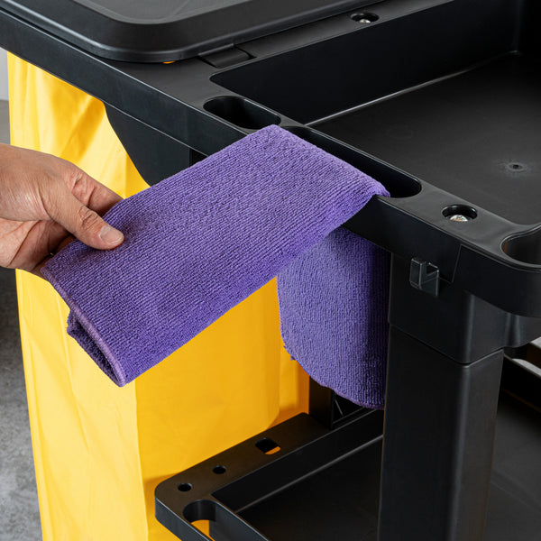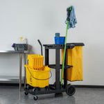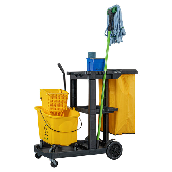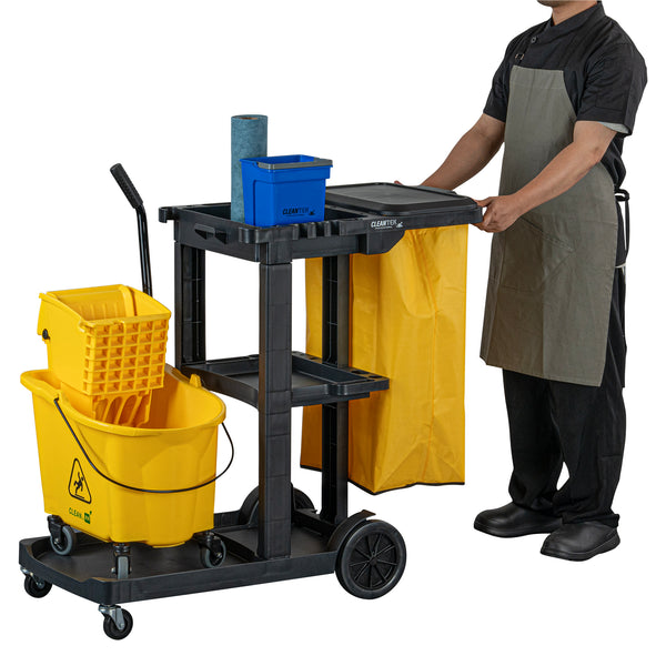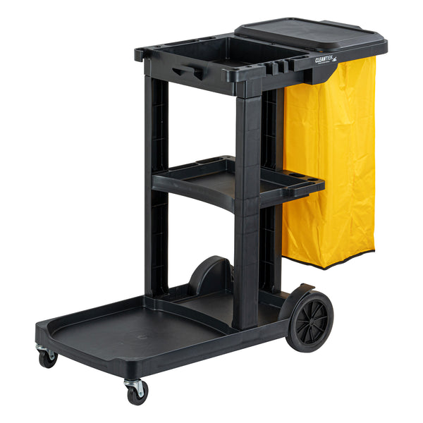 Optimize your cleaning tasks with our Clean Tek Professional Black 3-Shelf Janitor Cart. Equipped with a rugged 18-gallon bag, this janitor cart provides ample space for waste or laundry collection and can be easily removed for emptying. Featuring a lid, this cleaning trolley helps hide soiled linens and reduce odors. With 3 sturdy shelves, this cleaning cart offers ample storage space for cleaning supplies and equipment, ensuring you stay organized. The mop and broom holder of this cleaning cart on wheels keeps cleaning tools securely in place, providing easy access while you work. The spacious front platform on this janitor trolley can hold an additional trash can, mop bucket, or wringer. This black janitor cart is equipped with 4 non-marking casters and enhances mobility without damaging hard floors. The retaining lip of this 3-shelf janitor cart ensures your items stay securely in place. Measuring 44.09 inches in length by 18.5 inches in width by 38.98 inches in height, this heavy-duty janitor cart fits perfectly in various storage areas. Sold in a box with 1 janitor cart, 1 bag, and 1 lid.