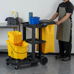 - 3-tiered shelves provide room for organizing and storing cleaning supplies and equipment