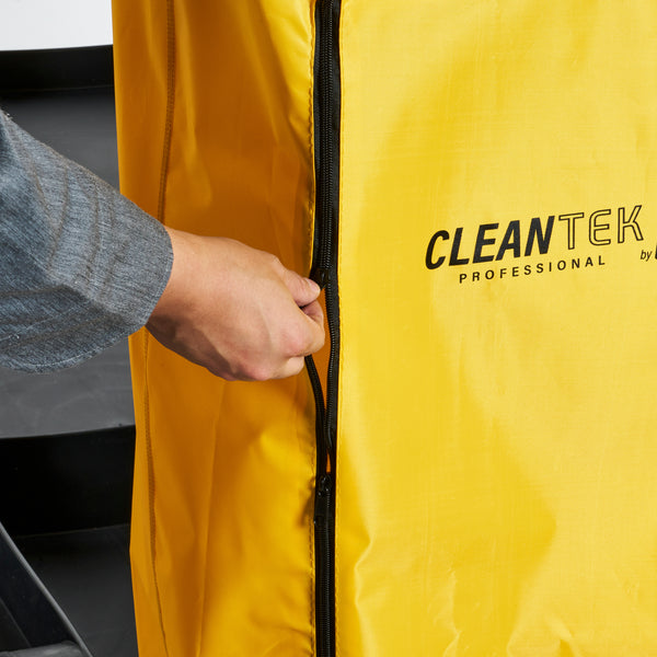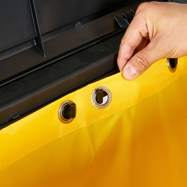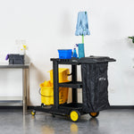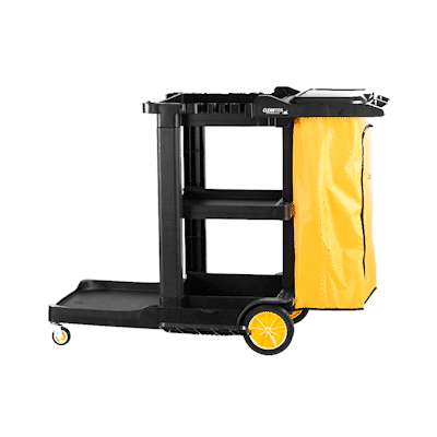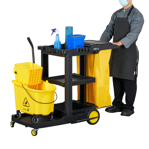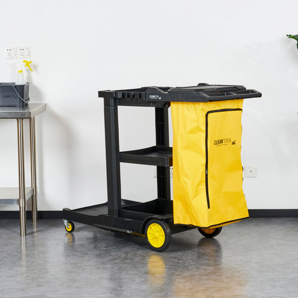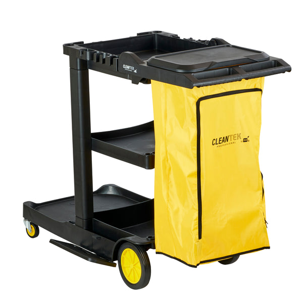 Optimize your cleaning routine with our Clean Tek Professional Black Heavy Duty 3-Shelf Janitor Cart. This janitor cart comes with a rugged 21-gallon bag, providing ample space for waste or laundry collection, which can be easily removed for emptying. To help hide soiled linens and reduce odors, this cleaning cart on wheels includes a convenient lid. This 3-shelf janitor trolley offers abundant storage for cleaning supplies and equipment, ensuring efficiency and organization in any cleaning task. With a secure mop and broom holder, this cleaning trolley keeps your cleaning tools readily accessible and well-organized. Featuring a spacious front platform, this janitor trolley is large enough to hold an additional trash can, mop bucket, or wringer. Equipped with 4 non-marking casters, this cleaning cart provides additional mobility without damaging hard floors. With a retaining lip, this janitor cart prevents items from falling off during transport. Measuring 52.36 inches in length by 33.46 inches in width by 38.98 inches in height, this 3-shelf cleaning cart offers substantial capacity and dimensions. Sold in a box with 1 janitor cart, 1 bag, and 1 lid.