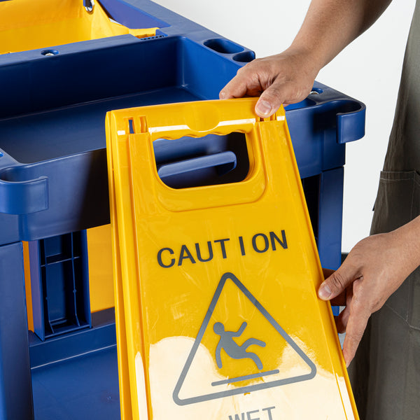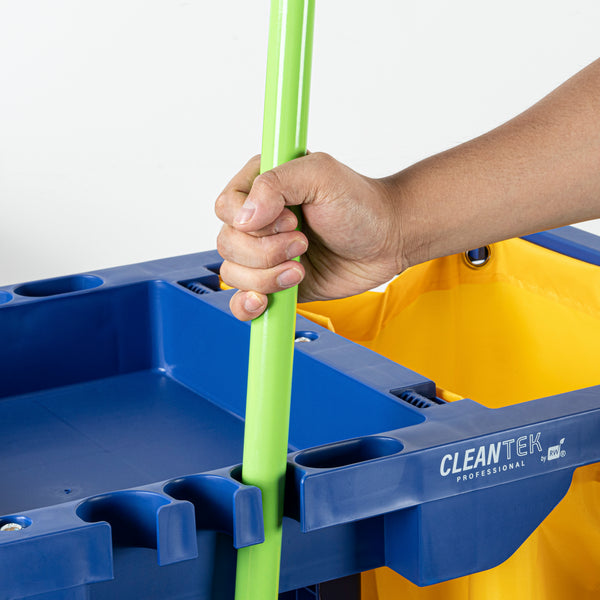 Equipped with a mop and broom holder, this janitor trolley keeps cleaning tools securely in place for quick and convenient access. The smooth rolling wheels provides enhanced mobility.