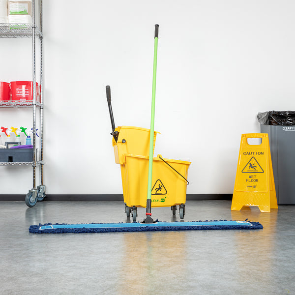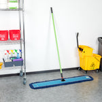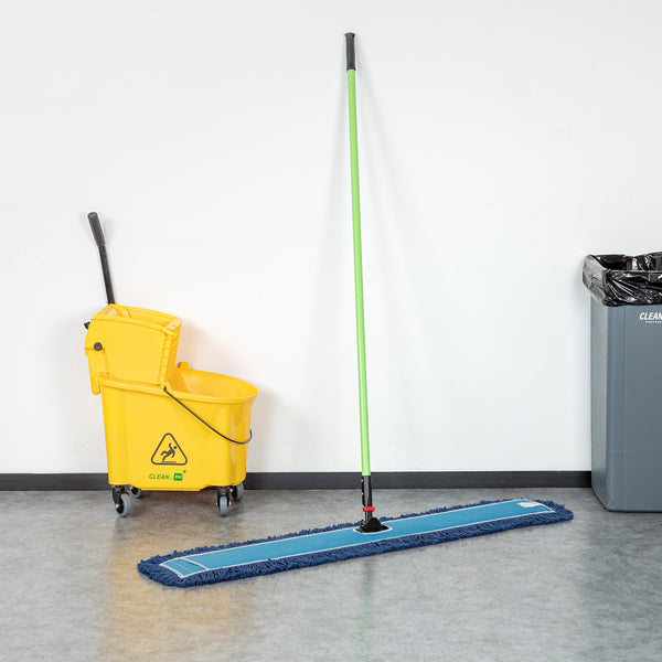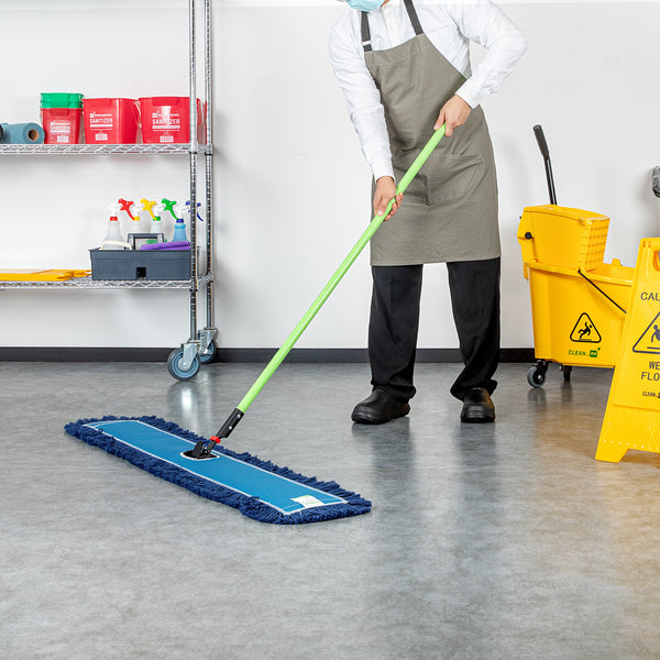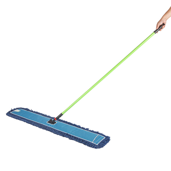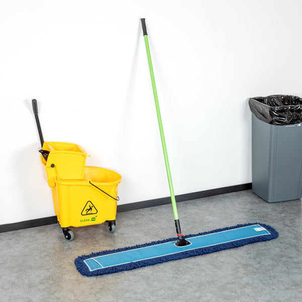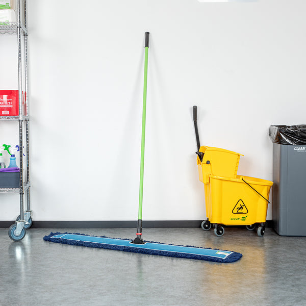 Effortlessly maintain the cleanliness of your foodservice establishment with our Clean Tek Professional Blue Cotton-Poly Blend Dust / Dry Mop. This commercial dust mop set includes a dusting head, handle, and frame, providing a comprehensive cleaning solution for hard-to-reach areas. Featuring a 64-inch handle, this floor duster provides increased range, making it easier to clean large areas and challenging spots without the need for bending or stretching. Expertly crafted from a cotton-poly blend, this dry mop efficiently captures dust and fine particles while offering durability for extended use across multiple surfaces. The sturdy iron mop frame of these dust mop ensures it does not bend or warp with frequent use, providing long-lasting performance. Each machine washable mop head is designed for easy cleaning and reuse, providing a convenient solution for maintaining cleanliness. Designed to cover extensive surfaces, this floor dust mop measures 48.03 inches in length by 5 inches in width by 64.96 inches in height, making it the perfect choice for any foodservice operation looking to keep floors spotless. Sold in a 1 count box.