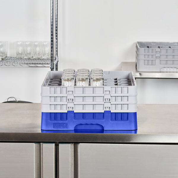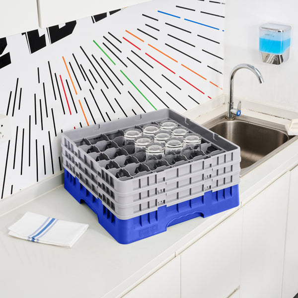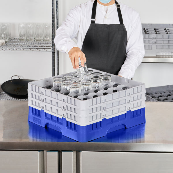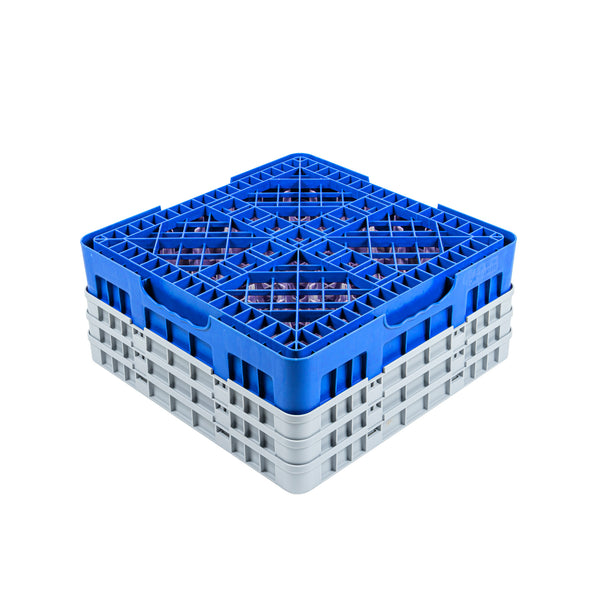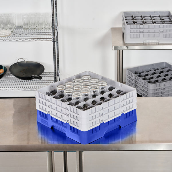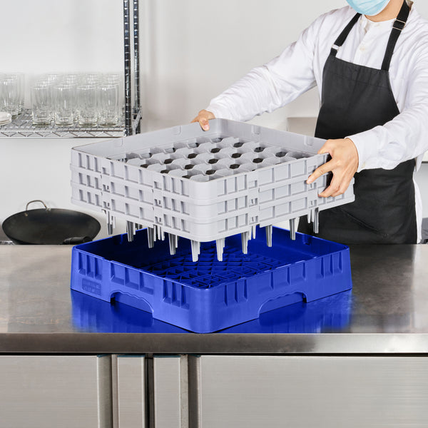 Enhance your glassware storage solutions with our Clean Tek Professional Blue Glass Rack. Featuring 36 compartments, this dishwasher rack ensure each piece of glassware is securely stored and protected. The included full drop extender, and two half drop extenders make this compartment rack versatile for various glass sizes. Constructed from durable PP, this commercial glass rack is built to withstand the rigors of daily use. Its easy-to-handle design allows for effortless transportation and organization of barware. Designed with open interior compartments, this glass rack provides optimal airflow for quick drying. The solid external walls add an extra layer of protection to keep glassware safe during transport. Measuring 19.69 inches in length by 19.69 inches in width by 8.86 inches in height, this barware organizer is perfectly sized for commercial kitchens and bars. Sold in a 1 count box.