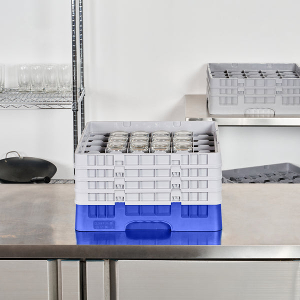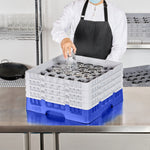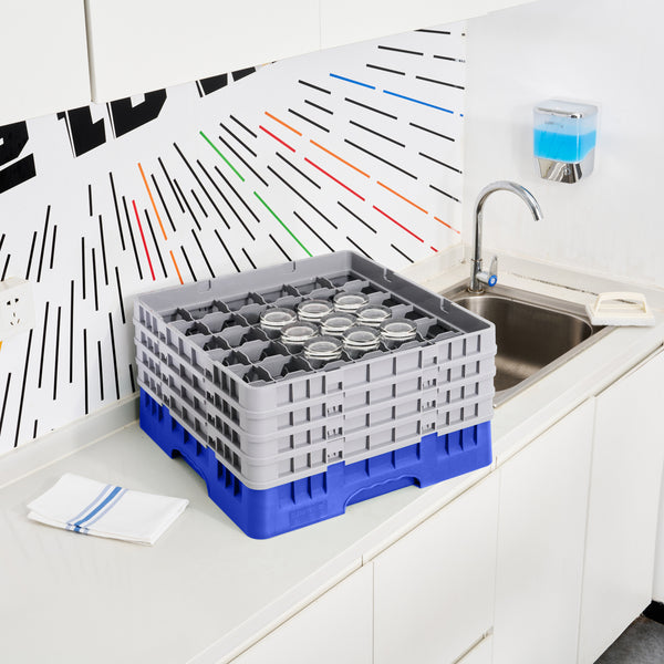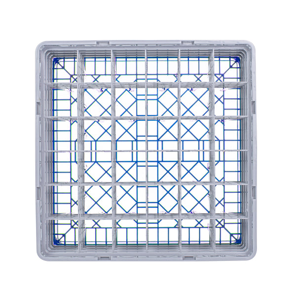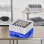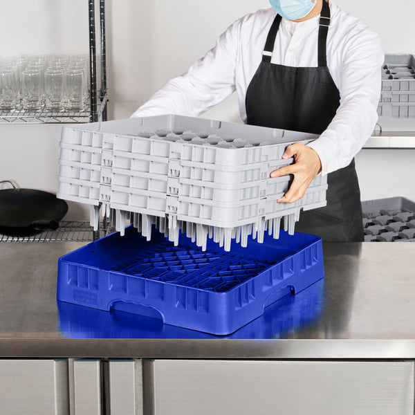 Optimize glassware storage in your establishment with our Clean Tek Professional Blue Glass Rack. Designed with 36 compartments, this dishwasher rack provides ample space for securely organizing glassware. Featuring a full drop extender and three half drop extenders, this compartment rack is adaptable to accommodate various glass sizes. Constructed from durable PP material, this barware organizer ensures long-lasting use in busy kitchens. The easy-to-handle design of this commercial glass rack allows for effortless maneuvering and stacking. With open interior compartments, this rack maximizes airflow for efficient drying, while the solid external walls offer added stability and protection. Measuring 19.69 inches in length by 19.69 inches in width by 10.51 inches in height, this dishwasher rack fits seamlessly into standard kitchen setups. Sold in a 1 count box.