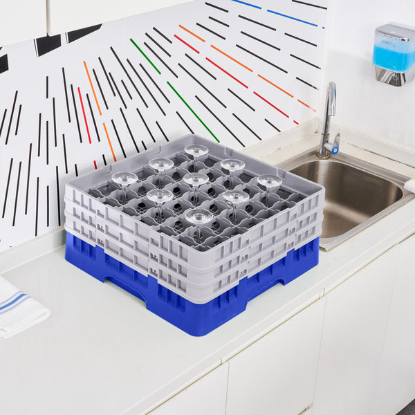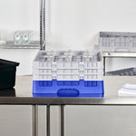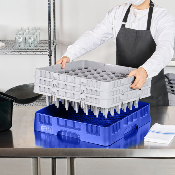 Our Clean Tek Professional Blue Glass Rack is the ultimate solution for organizing your barware with precision and ease. Designed with 49 compartments, this glassware storage rack ensure each glass is securely stored and protected during washing. Featuring a dishwasher rack design, this rack includes a full drop extender and two half drop extenders to accommodate various glass heights effortlessly. Crafted from durable PP material, this compartment rack ensures longevity and resilience in commercial settings. The easy-to-handle design of this rack simplifies transporting and maneuvering, making it a favorite among busy kitchen staff. With open interior compartments, this barware organizer allows for optimal water and air circulation for superior cleaning and drying. Solid external walls provide additional protection, ensuring the safety of your valuable glassware. Measuring 19.69 inches in length by 19.69 inches in width by 8.86 inches in height, this commercial glass rack fits seamlessly into most kitchen spaces. Sold in a 1 count box.