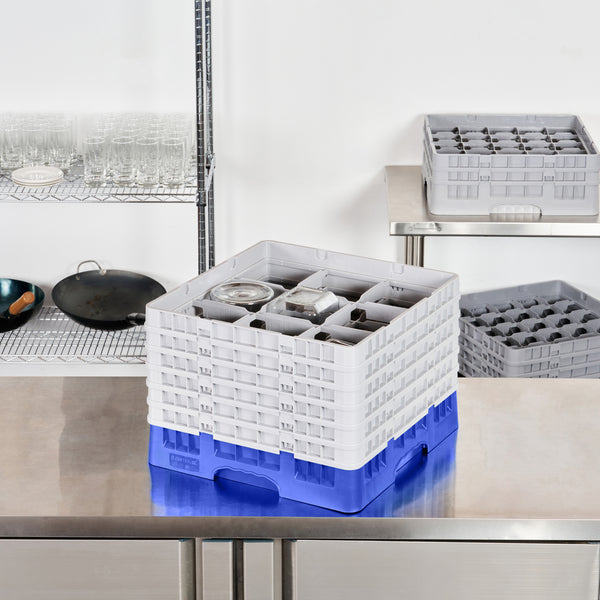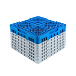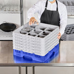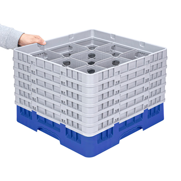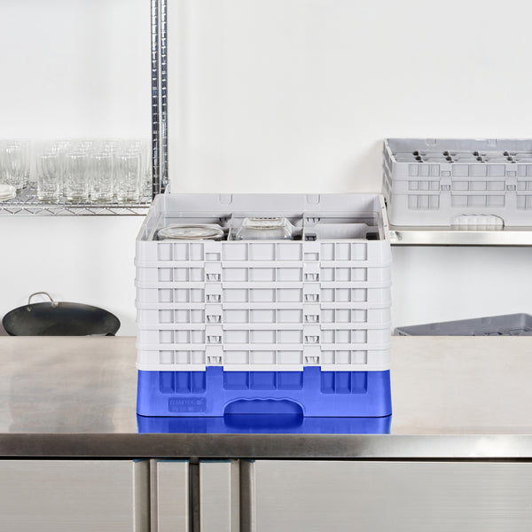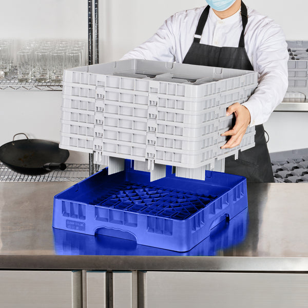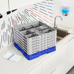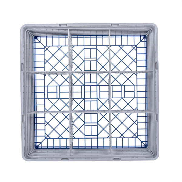 Optimize your glassware storage with our Clean Tek Professional Blue Glass Rack. This commercial glass rack features 9 compartments, providing efficient organization for your barware. Equipped with 1 full drop extender and 5 half drop extenders, this dishwasher rack adapts to various glass heights with ease. Made from durable PP, this rack ensures long-lasting use in demanding settings. The easy-to-handle design of this rack simplifies transportation and reduces the risk of breakage. With open interior compartments, this compartment rack allows for thorough cleaning and quick drying of glassware. The solid external walls offer enhanced protection, making this rack ideal for busy foodservice establishments. Measuring 19.69 inches in length by 19.69 inches in width by 13.74 inches in height, this barware organizer fits seamlessly into most commercial dishwashers. Sold in a 1 count box.
