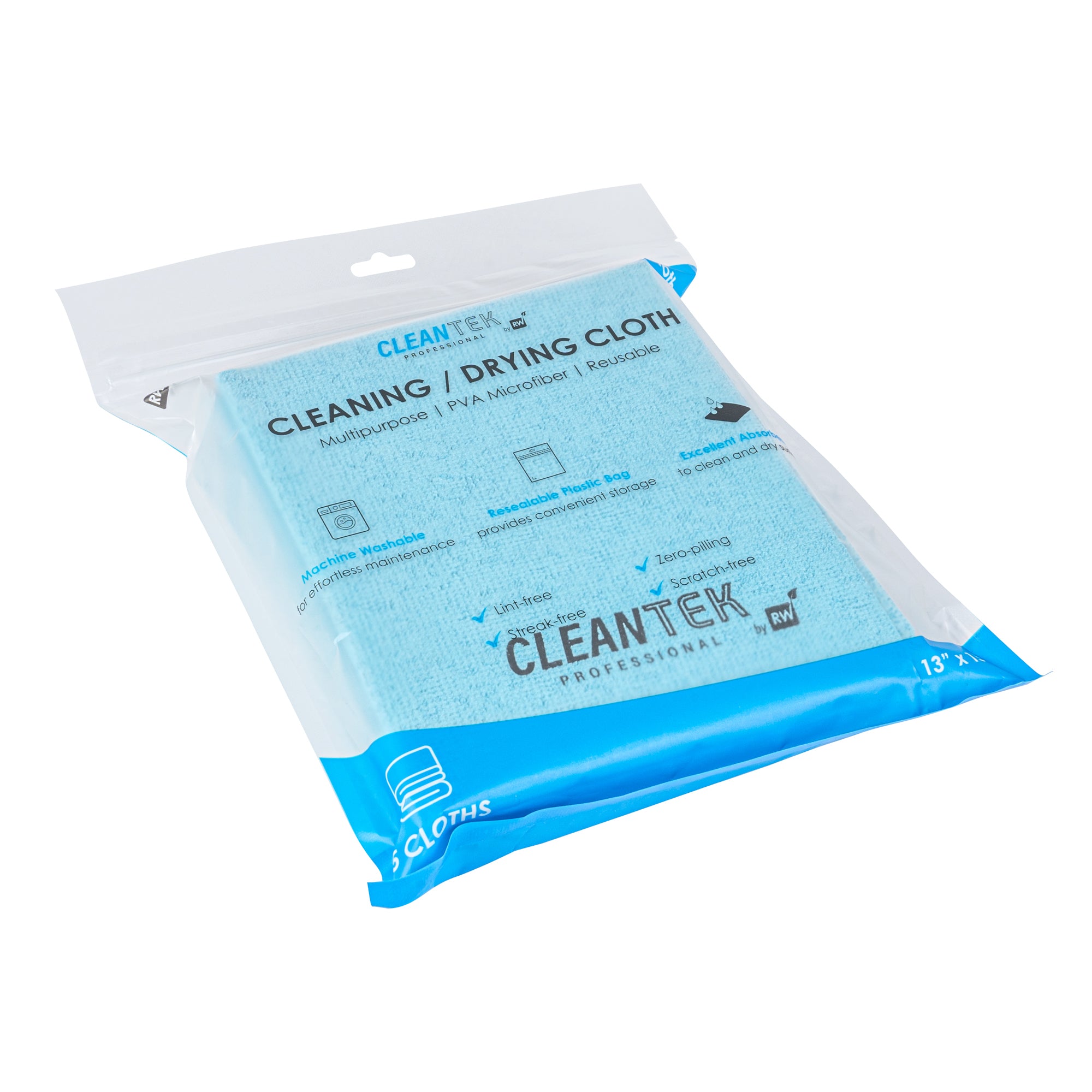 Make your cleaning tasks more efficient with our Clean Tek Professional Blue Microfiber Cleaning / Drying Cloths. Crafted from PVA microfiber, these cleaning cloths harden when dry and prevent bacteria growth to promote a healthier work environment. To effortlessly tackle spills and dry surfaces without any streaks, these microfiber towels are highly absorbent. These multipurpose cleaning rags are ideal for a wide range of tasks, including dusting, wiping surfaces, polishing, and absorbing spills. Boasting a lint-free fabric, these cleaning towels provide an impeccable cleaning experience without leaving any residue. The zero-piling design of these microfiber rags ensures enhanced durability and longevity by preventing the formation of fuzzy balls and minimizing the risk of shedding fibers and lints. These wash towels are versatile and suitable for use with a variety of cleaning agents. Ideal for cleaning delicate items and preserving surfaces, these wiping rags are scratch-free to provide a gentle and effective cleaning solution. The blue finish of these drying cloths facilitates easy identification, minimizing the risk of mix-ups and ensuring efficient use for specific tasks. Each microfiber rag comes in a convenient resealable plastic bag for easy storage and to maintain cleanliness. These car wash towels are machine washable to provide a hassle-free and reusable solution for your cleaning needs. Measuring 13 inches in length by 15 inches in width, these microfiber cloths offer ample coverage for any cleaning task. Sold in a 5 count box.