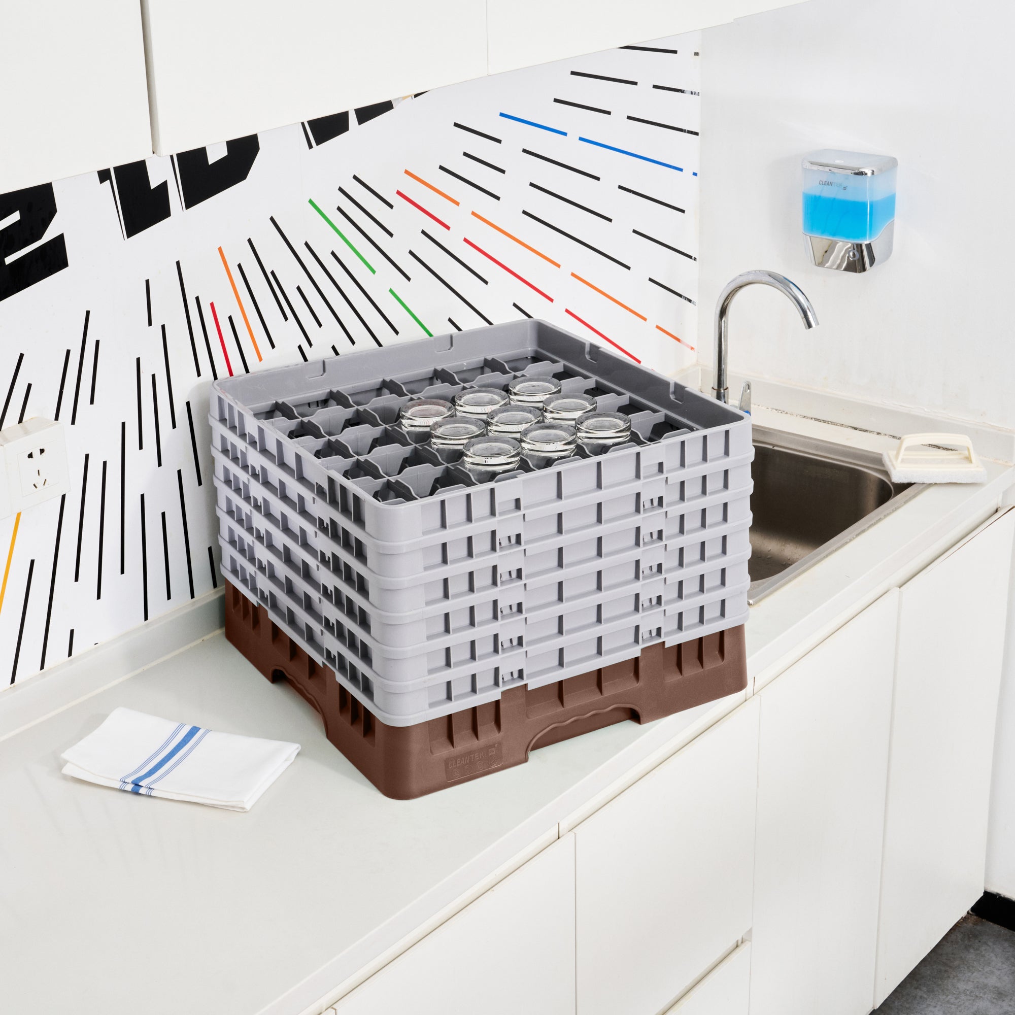 Our Clean Tek Professional Brown Glass Rack provides the ultimate glassware storage solution for any foodservice establishment. Designed with 36 compartments, this compartment rack ensures each piece of glassware is securely held in place. This glass rack comes equipped with a full drop extender and five half drop extenders to easily accommodate various glass sizes. Featuring durable PP construction, this dishwasher rack withstands the rigors of commercial use. The easy-to-handle design of this barware organizer simplifies transport and storage, making it a must-have for busy bars and restaurants. With open interior compartments, this commercial glass rack promotes efficient drying and sanitation. Meanwhile, solid external walls offer robust protection to keep your glassware safe. Measuring 19.69 inches in length by 19.69 inches in width by 13.74 inches in height, this glass rack is perfectly sized for optimal space utilization. Sold in a 1 count box.