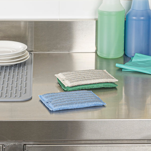Minimize downtime with the quick-drying Clean Tek Professional Quick-Drying Scouring Pad. This scouring pad is expertly crafted from plastic to ensure it dries rapidly, allowing for efficient cleaning cycles and reducing wait times between uses. Designed with an odor-free construction, it effectively prevents cross-contamination of scents, making it an ideal choice for maintaining kitchen hygiene. The durable design withstands frequent foodservice tasks, providing a reliable alternative to the traditional steel wool sponge for heavy-duty cleaning. With a dual-sided feature, one side reinforced with iron wire and the other with wood fiber, this versatile non-scratch scrubber is perfect for various cleaning needs, although it is not suitable for coated pots. Measuring 5.5 inches in length, 3.9 inches in width, and 0.4 inches in height, it fits comfortably in hand, ensuring ease of use. Enhance your cleaning efficiency with this multi-purpose tool. Each order includes 60 Clean Tek Professional Quick-Drying Scouring Pads.