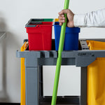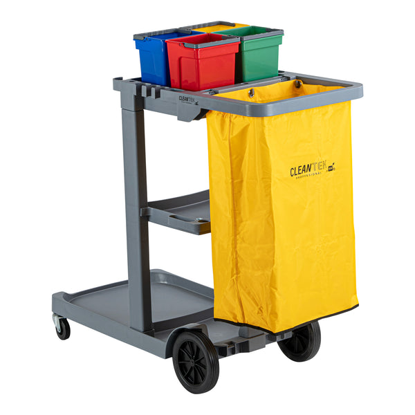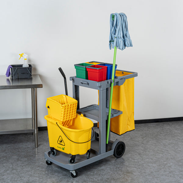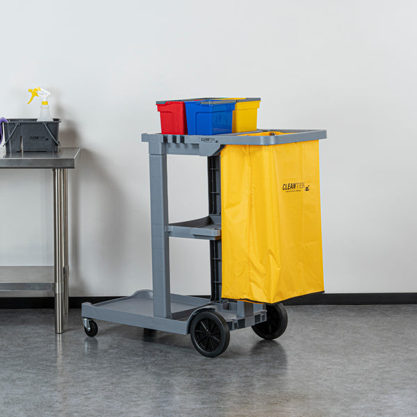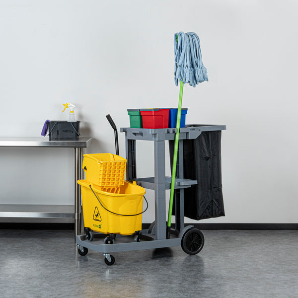 Optimize your cleaning routine with our Clean Tek Professional Gray 3-Shelf Janitor Cart. This janitor cart comes with a rugged 18-gallon bag that provides ample space for waste or laundry collection, and it can be easily removed for emptying. For efficient cleaning, this cleaning cart comes with 4 removable buckets that are color-coded, making it easy to distinguish your cleaning supplies. Each included bucket of this cleaning trolley holds up to 4 quarts and offers ample capacity for various cleaning tasks. Equipped with 3 sturdy shelves, this cleaning cart on wheels provides storage space for cleaning supplies and equipment, ensuring efficiency and organization in any cleaning task. The mop and broom holder of this janitor trolley keeps cleaning tools securely in place, providing easy access and organization while you work. Plus, this gray cleaning trolley features 4 non-marking casters that provide additional mobility without damaging your hard floors. The retaining lip on this heavy-duty janitor cart keeps your items from falling off. Measuring 44.09 inches in length by 18.5 inches in width by 43.31 inches in height, this gray cleaning cart offers generous dimensions for all your cleaning needs. Sold in a box with 1 janitor cart, 1 bag, and 4 buckets.