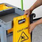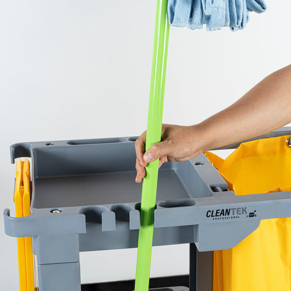 Equipped with a mop and broom holder, this janitor trolley keeps cleaning tools securely in place for quick and convenient access. The smooth rolling wheels provides enhanced mobility.