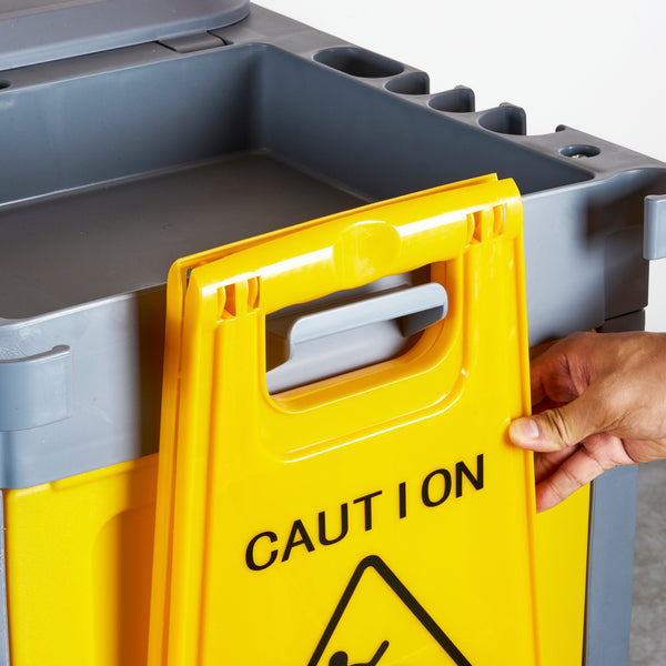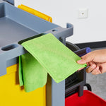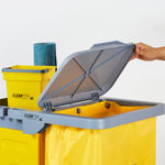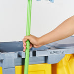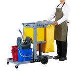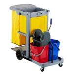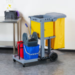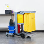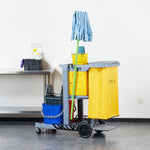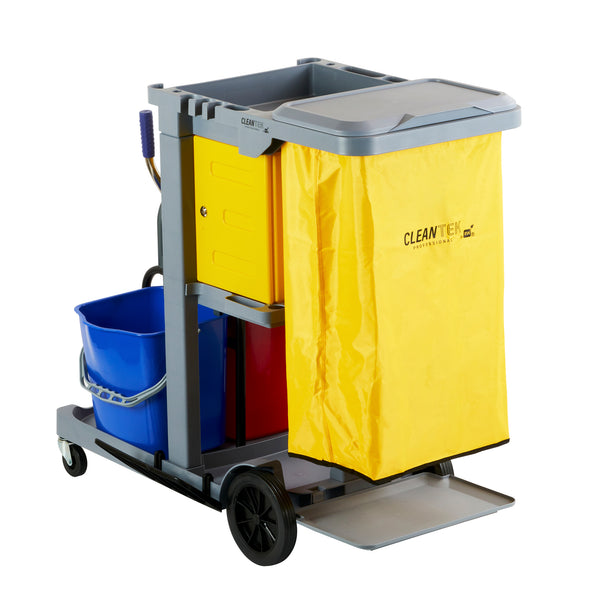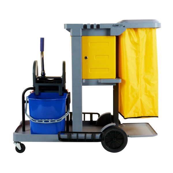 Enhance your cleaning efficiency with our Clean Tek Professional Gray 3-Shelf Janitor Cart. This janitor cart comes with a rugged 18-gallon bag that provides ample space for waste or laundry collection and can be easily removed for emptying. Featuring a lid to help hide soiled linens and reduce odors, this cleaning cart ensures a more pleasant environment. This cleaning trolley includes 2 removable buckets that are color-coded, allowing you to distinguish your cleaning supplies for safe, efficient cleaning. The wringer of this janitorial cart has a press-down style handle and effectively removes excess water from mop heads. Each bucket of this gray cart can hold up to 4 quarts, offering ample capacity for various cleaning tasks and efficient liquid management. Designed to provide storage space, this cleaning cart on wheels features locking cabinet doors to keep cleaning supplies secure and out of sight. This janitor trolley has 3 sturdy shelves, providing ample storage space for cleaning supplies and equipment, ensuring efficiency and organization in any cleaning task. The mop and broom holder of this 3-shelf cleaning cart keeps your tools in place, providing easy access and organization while you work. With 4 non-marking casters, this gray janitor trolley provides additional mobility without damaging your hard floors. The retaining lip of this premium cleaning cart keeps your items from falling off. Measuring 44.09 inches in length by 27.95 inches in width by 38.98 inches in height, this janitor cart with shelves offers ample space for all your cleaning needs. Sold in a box with 1 janitor cart, 1 bag, 1 lid, 1 locking cabinet, 1 wringer, and 2 buckets.