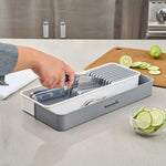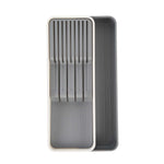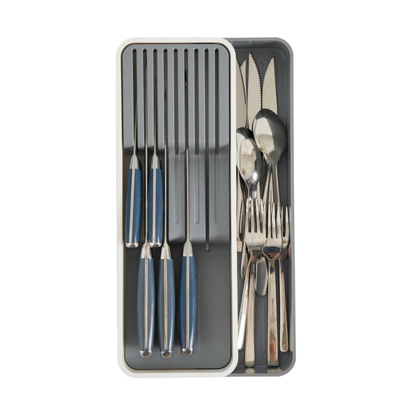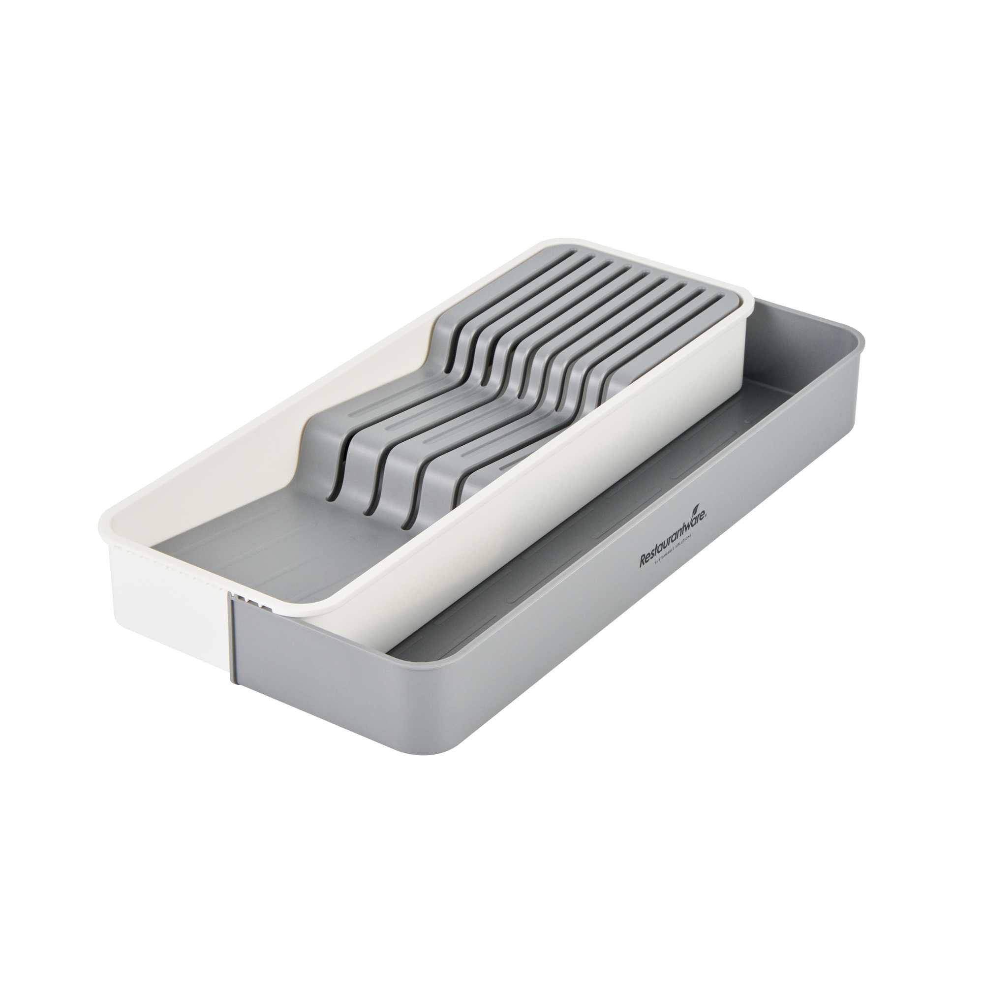 Maximize your kitchen's efficiency with space-saving solutions. The Clean Tek Professional Gray and White Plastic Expandable 2-Tier Knife Drawer Organizer provides a versatile and organized way to safely store your knives while saving valuable countertop space. Its expandable design adjusts to accommodate various knife sizes, making it an ideal expandable knife organizer for chefs and home cooks alike. Featuring a compact layout, this kitchen knife organizer maximizes drawer space, allowing you to keep utensils within easy reach. With designated slots for up to 5 small knives and 4 large knives, this knife drawer insert is perfect for maintaining order in your culinary workspace. The sleek gray color seamlessly coordinates with modern kitchen aesthetics, ensuring your kitchenware remains stylish and functional. Each order includes 1 organizer.